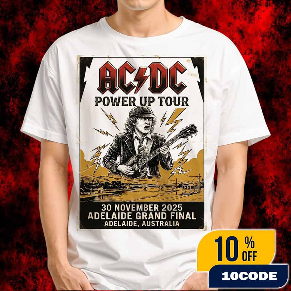 This officially licensed unisex t-shirt commemorates AC/DC’s historic November 30, 2025 performance at the bp Adelaide Grand Final, marking the legendary Australian rock band’s first return to Adelaide in over a decade as the headlining act of this prestigious motorsport event’s Sunday night concert. Featuring vintage concert art design with iconic imagery of lead guitarist Angus Young and the band’s signature lightning bolt motif, this limited-edition Power Up Tour merchandise celebrates AC/DC’s triumphant 2025 Australian homecoming following their record-breaking global tour that sold over 2 million tickets across 24 European shows and 10 sold-out North American performances. The shirt showcases the distinctive aesthetic of the Power Up Tour named after their 2020 album that debuted at #1 on the ARIA Chart and in 20 countries worldwide, bringing together the classic lineup of Angus Young on lead guitar, Brian Johnson on vocals, Stevie Young on rhythm guitar, Matt Laug on drums, and Chris Chaney on bass, with special guests Australian rock sensation Amyl and the Sniffers. Fans attending the Adelaide Grand Final can access exclusive city-specific tour merchandise at the official AC/DC High Voltage Pop-Up Store located at The Lady Daly (126 Port Rd, Hindmarsh SA 5007), open November 29th from 12 PM-10 PM and show day November 30th from 11 AM-5 PM, featuring limited-edition vinyl records, city event posters, and tour apparel unavailable anywhere else. This premium concert tee captures the monumental pairing of what South Australian Premier Peter Malinauskas called “the world’s greatest rock and roll band headlining the greatest motorsport event in the country,” with concert tickets ranging from $99 general admission to $305 premium Area A standing, making this shirt an essential piece of rock memorabilia for collectors and fans celebrating AC/DC’s 52-year legacy and over 200 million albums sold worldwide.