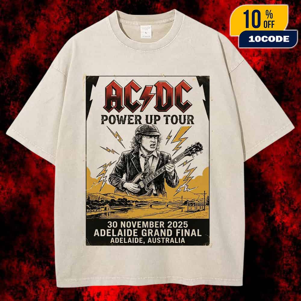 Commemorate the legendary return of rock icons AC/DC to Australia with this Power Up Tour 2025 T-shirt, featuring exclusive artwork for the massive bp Adelaide Grand Final concert on November 30, 2025. Held at the historic Adelaide Parklands Circuit, this event marks the band’s first Adelaide performance in a decade, closing out the prestigious Supercars championship alongside special guests Amyl and the Sniffers. The vintage-inspired design showcases Angus Young in his signature schoolboy uniform shredding the Gibson SG, framed by the iconic high-voltage Lightning Bolt logo and “PWR UP” motifs from their #1 hit album. Printed on premium washed unisex fabric, this collector’s item captures the electrifying energy of the “Thunderstruck” legends as Brian Johnson, Stevie Young, and Matt Laug deliver a high-decibel setlist of classics like “Back in Black” and “Highway to Hell” to a crowd of racing and rock fans. A must-have piece of Australian tour merchandise for devoted rockers and motorsport enthusiasts alike.