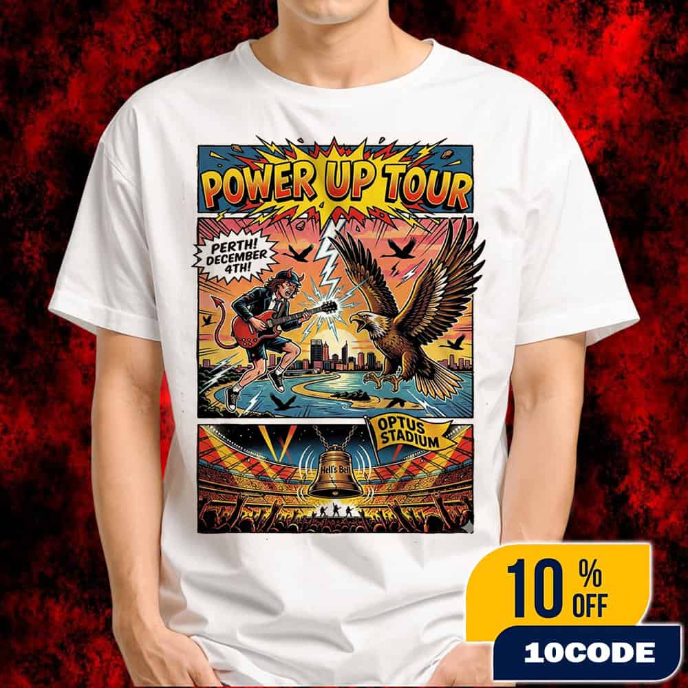 This officially licensed unisex t-shirt features exclusive vintage comic book-style artwork commemorating AC/DC’s triumphant return to Perth on December 4th, 2025, at Optus Stadium as part of their globally acclaimed Power Up Tour, marking the legendary rock band’s first Western Australia performance in over a decade. The striking design showcases a dynamic battle scene between the iconic Angus Young Devil mascot and the West Coast Eagles rendered in classic Bronze Age comic aesthetic with halftone dots, bold outlines, and vibrant sunset gradients, prominently featuring the legendary Hell’s Bell that will descend from Optus Stadium’s rafters during the live show, creating an authentic piece of concert memorabilia that captures the explosive energy of AC/DC’s high-voltage performance. Fans can purchase this exclusive Perth city-specific tour shirt at the official AC/DC High Voltage Pop-Up Store located at Cleaver House (45 Plaistowe Mews, West Perth WA 6005), open December 3, 5, 6, 7 from 12 PM-10 PM and show days December 4 & 8 from 11 AM-5 PM, where they can also discover legendary tour props including the actual tour cannon and Hell’s Bell, plus limited-edition vinyl records unavailable anywhere else. This premium concert tee celebrates AC/DC’s historic double-header performances at Perth’s 60,000-capacity Optus Stadium on December 4th and 8th, featuring the classic lineup of Angus Young on lead guitar, Brian Johnson on vocals, Stevie Young on rhythm guitar, Matt Laug on drums, and Chris Chaney on bass, with support from Australian rock sensation Amyl and the Sniffers and local favorites Southern River Band, with doors opening at 5 PM and showtime at 6:10 PM AWST. Concert tickets for this landmark event range from approximately $40 USD general admission to $460 USD premium seating, and this collectible shirt represents an essential piece of rock history from a band that has sold over 200 million albums worldwide and delivered record-breaking performances across their 2025 Power Up Tour with over 2 million tickets sold internationally.