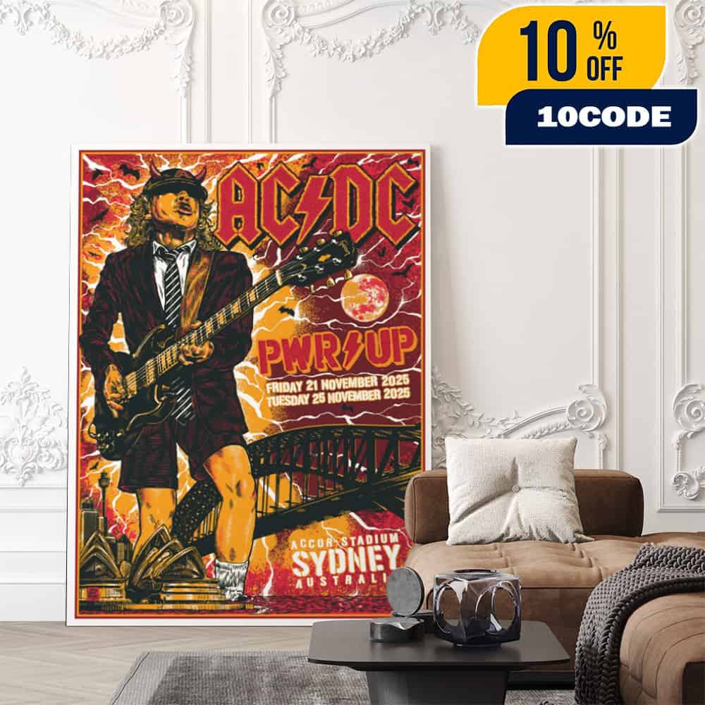 This collectible poster canvas home decor features exclusive concert artwork by Ben Brown commemorating AC/DC’s monumental POWER UP Tour performances at Accor Stadium Sydney on November 21 and 25, 2025, showcasing iconic guitarist Angus Young in his legendary stage presence. The artwork celebrates the world’s greatest rock and roll band’s triumphant return to Australia for their first tour in a decade since 2015, with both Sydney shows drawing over 70,000 fans each night to witness the powerhouse lineup of Angus Young on lead guitar, Brian Johnson on vocals, Stevie Young on rhythm guitar, Matt Laug on drums, and Chris Chaney on bass. The design captures the raw energy and electrifying atmosphere of these historic concerts, which ran from 6:10pm to 11pm featuring pyrotechnics and thunderous classics like “Back in Black,” “Thunderstruck,” and “Highway to Hell” alongside tracks from their 18th studio album PWR/UP. This premium canvas print commemorates a milestone chapter in the GRAMMY Award-winning Rock & Roll Hall of Fame inductees’ legendary career, as the POWER UP Tour has sold between 3.5 to 4 million tickets globally, making it one of the most successful rock tours in recent history. The poster artwork authentically represents the Australian rock explosion at Sydney Olympic Park’s premier 83,500-capacity stadium venue, where Australian punk rockers Amyl and the Sniffers and Sydney locals Large Mirage joined the bill for an unforgettable night of hard rock anthems. Tickets for these sold-out Sydney shows went on sale June 26, 2025 at 9am local time through Ticketek, with fans arriving early to enjoy food trucks and pre-show entertainment before gates opened at 5pm. This museum-quality canvas wall art serves as the perfect home decor piece for AC/DC fans, classic rock collectors, and anyone who appreciates the enduring legacy of one of the biggest-selling bands in music history, bringing the excitement of their legendary live performances into any living space.