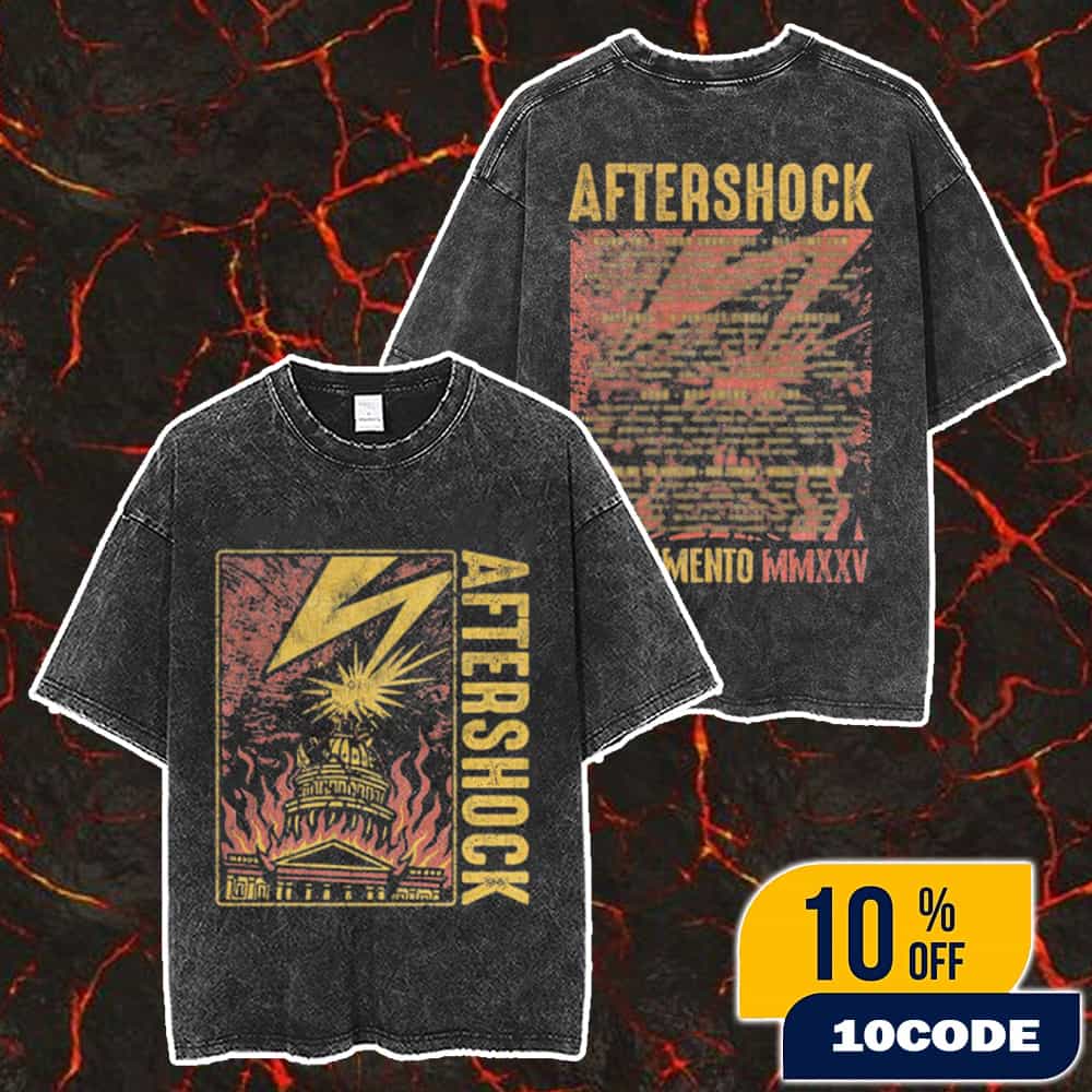This Aftershock Festival 2025 At Discovery Park Sacramento October 2-5 2025 Lightning Strike Tee is official two-sided washed merchandise commemorating the 13th annual Aftershock Festival, the West Coast’s largest rock and metal event featuring over 115 bands performing across four stages including headliners Blink-182 (Thursday, October 2), Deftones (Friday, October 3), Korn (Saturday, October 4), and Bring Me The Horizon (Sunday, October 5), alongside Good Charlotte, All Time Low, A Perfect Circle, Turnstile, Bad Omens, Gojira, Rob Zombie, Marilyn Manson, Taking Back Sunday, Three Days Grace with Adam Gontier, Dream Theater, GWAR celebrating their 40th anniversary, Machine Head, Motionless In White, and Mudvayne. The premium unisex vintage-washed t-shirt features a striking lightning bolt artwork on the front with dramatic glitch/distortion effects in vibrant red, orange, and yellow flames against a black background, accompanied by “AFTERSHOCK” text in gradient yellow-orange coloring, “SACRAMENTO” branding, and “MMXXV” (Roman numerals for 2025) in red, while the back displays the complete festival lineup with tour-date style typography listing all 115+ performing artists, event dates “OCTOBER 2-5,” and venue information from Discovery Park. This limited edition Lightning Strike design celebrates Sacramento’s 13th year hosting the massive four-day rock festival organized by Danny Wimmer Presents, which runs daily from 11 a.m. to 10 p.m. on Thursday and Sunday, and 11 a.m. to 11 p.m. on Friday and Saturday, attracting approximately 160,000 rock fans from all 50 states and over 30 countries to Discovery Park along the American River. The two-sided washed construction gives this official merchandise an authentic vintage concert tee aesthetic with a soft, lived-in feel, featuring complete lineup printing on the back including special reunion performances from The Dillinger Escape Plan’s first West Coast show, Acid Bath, Chiodos, Crossfade, Chimaira, and Spineshank, plus performances from Papa Roach, In This Moment, Evanescence, Sum 41, Rancid, The Offspring, Chevelle, Incubus, Pantera (Phil Anselmo and Rex Brown with Zakk Wylde and Charlie Benante), and Suicidal Tendencies, making it a must-have collector’s item for attendees who want to commemorate this historic lineup. This premium Lightning Strike merchandise joins Aftershock’s 2025 collection of over 60 exclusive designs including hoodies, hats, posters, and accessories available through Danny Wimmer Presents’ official merchandise store, with pre-orders shipping on or around September 29, 2025, capturing the essence of Sacramento’s vibrant rock culture and the festival’s evolution from its 2012 inception into one of North America’s premier hard rock and heavy metal festivals featuring multiple bars, food vendors, art installations, and unique experiences across the sprawling Discovery Park venue, with 4-Day GA passes starting at $589.99, VIP packages, and single-day tickets ranging from $195 to $568.
