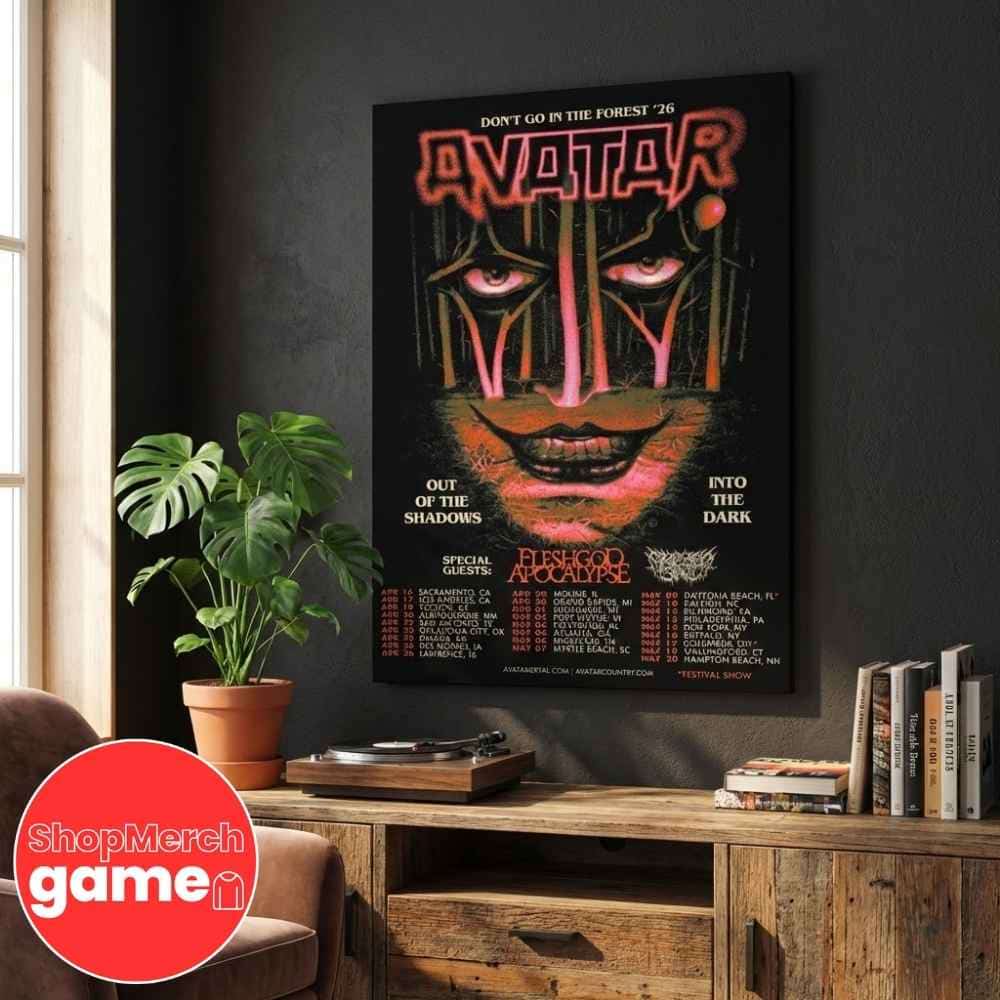 The Avatar “Don’t Go in the Forest ’26” tour poster commemorates Swedish heavy metal band Avatar’s massive North American headline run supporting their tenth studio album Don’t Go in the Forest, which was released on October 31, 2025 via Black Waltz Records. This canvas print captures the essence of one of 2026’s most anticipated metal tours, featuring the tagline “Out of the Shadows Into the Dark” that perfectly encapsulates the dark carnival theatrics and horror-infused atmosphere that Avatar, led by the dynamic and theatrical frontman Johannes Eckerström, has become renowned for over their 25-year career. The spring 2026 tour kicks off on April 16 in Sacramento, California at Channel 24 and concludes on May 20 in Hampton Beach, New Hampshire at Hampton Beach Casino, spanning over a month of intense performances across major North American venues including the Novo in Los Angeles, Rialto Theater in Tucson, Tabernacle in Atlanta, and House of Blues in Myrtle Beach. The tour also includes prestigious festival appearances at Welcome to Rockville in Daytona Beach on May 9 and Sonic Temple in Columbus, Ohio on May 17, cementing Avatar’s status as one of today’s most electrifying live metal acts. Supporting this monumental tour are two powerhouse extreme metal acts: Italy’s Fleshgod Apocalypse, a symphonic death metal band from Perugia formed in 2007 and signed to Nuclear Blast, renowned worldwide for their intricate fusion of brutal death metal with classical orchestration and operatic grandeur, and Worm Shepherd, an American blackened deathcore band from Brockton, Massachusetts, formed in 2020, who bring an intense blend of atmospheric darkness and crushing heaviness to the lineup. This touring package represents a perfect convergence of theatrical metal mastery, symphonic brutality, and deathcore intensity, making it an essential event for fans of extreme music. The album Don’t Go in the Forest marks a creative evolution for Avatar, with the band exploring new sonic territories they’ve never touched before, featuring standout tracks like the title song, “The Eagle Has Landed,” and “Death and Glitz,” all while maintaining their signature blend of heavy metal aggression and circus-like showmanship. As vocalist Johannes Eckerström ominously stated about the tour: “You can’t go back, as you don’t know where you came from. You don’t even dare to turn around, as you can feel someone, or something, watching. Here, it’s just you and the trees. We will be seeing you”. This tour poster serves as a tangible memento of Avatar’s most ambitious production to date, documenting a pivotal moment in modern heavy metal history where three generations of extreme music collide across iconic venues throughout North America.