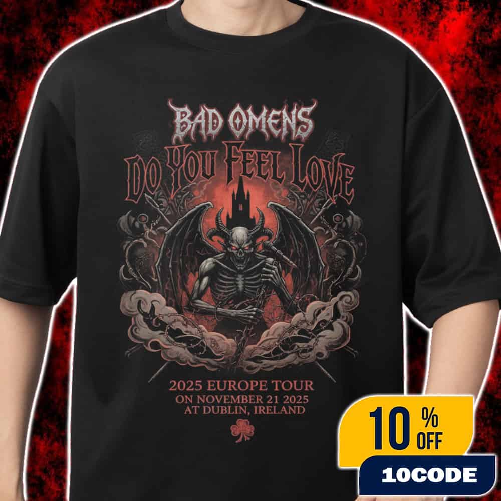 The Bad Omens Do You Feel Love 2025 Europe Tour On November 21 2025 At Dublin Ireland 3Arena Concert Poster Demonic Winged Skeleton Gothic Design Merch Unisex T-Shirt commemorates the opening night of the Richmond, Virginia metalcore band’s biggest headline run to date, launching their 13-show DO YOU FEEL LOVE EUROPE 2025 tour at Dublin’s iconic 3Arena on Friday, November 21, 2025, at 6:00 PM with tickets priced from €59.35 to €62.35 inclusive, featuring support from Pennsylvania metalcore veterans The Ghost Inside and rising alt-rock act Bilmuri for the entire European run through December 12 at Amsterdam’s AFAS Live. This official concert merchandise unisex t-shirt features striking demonic winged skeleton gothic design that perfectly captures Bad Omens’ signature dark aesthetic—monochromatic, dystopian imagery mirroring their cinematic sound that blends post-hardcore, synthwave, and alternative metal elements with lyrical themes exploring inner conflict, emotional fragility, and existential angst. The Dublin 3Arena show represents a milestone moment for Irish fans as Bad Omens—formed in 2015 by vocalist Noah Sebastian, guitarist Joakim “Jolly” Karlsson, bassist Nicholas Ruffilo, and drummer Nick Folio—bring their emotionally charged live experience to one of Europe’s premier venues following their meteoric rise to mainstream prominence with the 2022 hit “Just Pretend” from The Death of Peace of Mind, which has amassed over 100 million Spotify streams as part of the band’s 1 billion+ global streaming milestone. The expected setlist for the Dublin show will feature fan favorites including “CONCRETE JUNGLE,” “ARTIFICIAL SUICIDE,” “V.A.N,” “THE DRAIN,” “ANYTHING > HUMAN,” “Like a Villain,” “Take Me First,” “Glass Houses,” “Limits,” “THE DEATH OF PEACE OF MIND,” and “Just Pretend,” drawing from their 2016 self-titled debut through their latest releases, all delivered through Noah Sebastian’s commanding vocal range that effortlessly transitions between guttural growls and soaring clean vocals. This limited-edition concert t-shirt serves as essential wearable memorabilia for fans attending the Live Nation promoted European tour that continues through major arenas including Glasgow’s OVO Hydro (Nov 23), London’s Alexandra Palace (Nov 26 – SOLD OUT), Manchester’s Co-op Live (Nov 28), and Nottingham’s Motorpoint Arena (Nov 29 – SOLD OUT), with VIP upgrade packages available offering exclusive meet-and-greet experiences, early venue entry, and limited-edition tour merchandise. The demonic winged skeleton design connects to Bad Omens’ visual identity featuring skull and serpent imagery representing mortality, transformation, and the band’s exploration of darkness and light, making this t-shirt a must-have for devotees who can expect a meticulously crafted live experience complete with synchronized lighting, LED walls, and theatrical presentation that transforms their music into a sonic and visual narrative unfolding throughout the night. This collectible concert merch celebrates Bad Omens’ evolution from underground metalcore origins to becoming one of the most compelling acts in modern alternative rock, with their Dublin performance marking the beginning of a European conquest that showcases their genre-defying sound balancing brutal intensity with haunting vulnerability, atmospheric soundscapes, emotionally raw lyrics, and a stage presence that has earned comparisons to genre-defining acts like Bring Me The Horizon and Sleep Token.