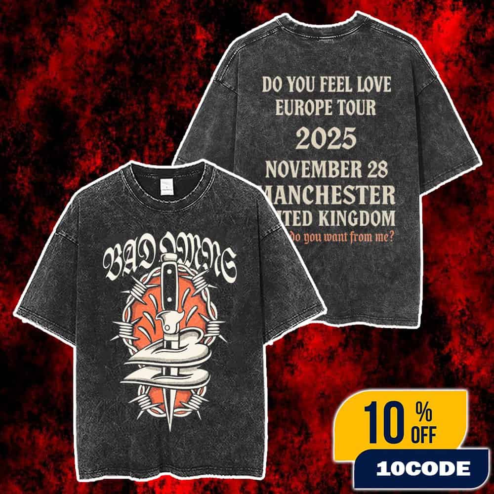 This exclusive two-sided vintage washed unisex t-shirt commemorates Bad Omens’ “Do You Feel Love Europe 2025” headline tour performance on Friday, November 28, 2025, at Co-op Live in Manchester, United Kingdom, featuring double-sided printing with a premium distressed wash finish that captures the band’s signature dark, cinematic aesthetic blending metalcore aggression with atmospheric synth-pop elements that have captivated over 2.7 billion streams globally. The premium vintage-style washed merchandise celebrates Bad Omens’ performance at Co-op Live—Europe’s largest indoor arena with a capacity of 23,500, located on the Etihad Campus in East Manchester at 1 Sportcity Way—marking one of five UK shows during their largest European headline run to date spanning 13 arena performances from November 21-December 12, 2025, with doors opening at 6:00 PM and the show starting at 7:00 PM, supported by special guests The Ghost Inside and Bilmuri, with the £365 million state-of-the-art venue featuring music-first design philosophy, the largest floor space of any indoor UK venue, tiered seating bringing fans closer to artists, and space for over 9,000 standing concert-goers. This collectible two-sided washed tee honors Bad Omens’ extraordinary rise as one of modern heavy music’s most innovative acts, led by vocalist/producer Noah Sebastian alongside guitarist Joakim Karlsson, bassist Nick Ruffilo, and drummer Nick Folio, who crafted their breakout third album “The Death of Peace of Mind” (February 25, 2022) that revolutionized metalcore by incorporating dense synths, glitchy electronic production, and dystopian cyberpunk aesthetics alongside crushing breakdowns, earning a Platinum-certified #1 Alternative Radio single “Just Pretend” and Gold certifications for “Like A Villain” and “Death of Peace of Mind” while establishing the band’s dominance that carried through 2024 touring with sold-out shows across North America and Europe. The Manchester Co-op Live performance will showcase Bad Omens’ evolution with their highly anticipated new single “Specter” (released August 2025) which debuted with over 1,000,000 Spotify streams in its first day—the band’s strongest streaming numbers ever—alongside fan-favorite setlist staples including “Just Pretend,” “Artificial Suicide,” “Like A Villain,” “The Death of Peace of Mind,” “Dethrone,” “Concrete Jungle,” “The Grey,” and “Miracle,” with the vintage washed two-sided design offering maximum visual impact featuring distressed printing on both front and back that combines the worn-in comfort of classic tour shirts with contemporary design aesthetics, making this limited-edition Manchester-specific merchandise essential for fans celebrating Bad Omens’ reputation for meticulous stage design, nocturnal visual aesthetics, and their position as one of the most in-demand live acts at one of Europe’s most impressive new entertainment venues.