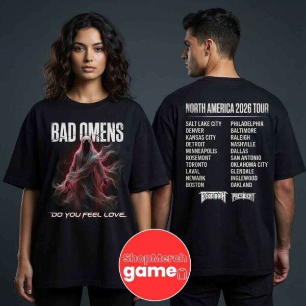 Bad Omens, the Richmond, Virginia-based metalcore phenomenon that has dominated the alternative metal scene since their formation in 2015, brings their electrifying “DO YOU FEEL LOVE” North America 2026 Tour to fans across the continent, cementing their status as one of the most innovative and boundary-pushing acts in modern heavy music. Led by the enigmatic frontman Noah Sebastian, whose haunting vocals and introspective lyrics have captivated millions, Bad Omens has evolved from underground favorites to arena-filling powerhouses, with their latest tour representing the culmination of years spent crafting a signature sound that seamlessly blends crushing metalcore breakdowns with atmospheric electronic elements and nu-metal influences. This comprehensive tour merchandise celebrates every stop on their ambitious North American journey, featuring Beartooth, the Columbus, Ohio hardcore titans fronted by the multi-talented Caleb Shomo, whose relentless energy and raw emotional intensity perfectly complement Bad Omens’ darker aesthetic, alongside rising stars President, creating a three-band lineup that represents the cutting edge of contemporary heavy music. The “DO YOU FEEL LOVE” tour name itself suggests a thematic exploration of emotion, connection, and vulnerability within the context of heavy music, themes that have become increasingly central to Bad Omens’ artistic identity as they’ve matured from their self-titled 2016 debut through breakthrough albums like “Finding God Before God Finds Me” (2019) and the critically acclaimed “The Death of Peace of Mind” (2022), which spawned viral hits and expanded their fanbase exponentially across streaming platforms and social media. This unisex t-shirt serves as a wearable chronicle of an entire continental tour, allowing fans to commemorate not just a single concert experience but the complete journey of three of alternative metal’s most compelling acts as they traverse North America’s diverse venue landscape, from intimate theaters to massive amphitheaters. For collectors and dedicated fans, this full tour stops design represents an essential piece of music memorabilia that captures a specific moment in Bad Omens’ trajectory as they continue to push creative boundaries and redefine what modern heavy music can achieve in 2026.