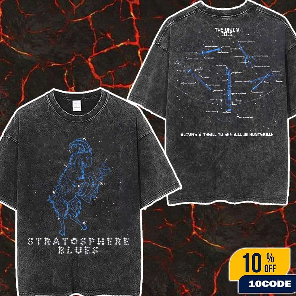 This Billy Strings Stratosphere Blues Live At The Orion 2025 vintage-washed two-sided t-shirt commemorates the Grammy-winning bluegrass virtuoso’s spectacular three-night residency at The Orion Amphitheater in Huntsville, Alabama, running October 23-25, 2025, where ticket prices ranged from $66 to over $200 per night, reflecting the high demand for Billy’s electrifying live performances at this premier 8,000-capacity venue that earned Billboard’s Top Music Venues 2024 recognition. The premium cotton shirt features distinctive two-sided printing with celestial goat constellation artwork that symbolizes Billy Strings’ fan community known as “Goats”—a term representing the curiosity, independence, and fearlessness embodied in his genre-defying music that seamlessly blends traditional bluegrass with psychedelic rock and jam band influences. “Stratosphere Blues” references one of Billy’s signature extended jam pieces frequently performed during his 2025 tour setlists, often paired with “I Believe in You” as showcased at his Ball Arena Denver performance on January 26, 2025, and Rupp Arena show on June 20, 2025, demonstrating his improvisational mastery that has captivated audiences worldwide. The vintage-washed finish gives this official tour merchandise an authentic lived-in aesthetic that resonates with fans seeking collectible memorabilia from Billy’s historic Huntsville performances, making it both a fashionable wardrobe staple and a cherished keepsake from the Fall Tour 2025. As Billy Strings continues his meteoric rise following his two Grammy Awards for Best Bluegrass Album and the success of his latest studio release “Highway Prayers” co-produced with Jon Brion, this exclusive Orion Amphitheater merchandise represents a tangible connection to one of contemporary bluegrass music’s most dynamic and innovative artists performing at the heart of Alabama’s Americana Music Triangle, near the legendary Muscle Shoals recording studios that shaped American music history.