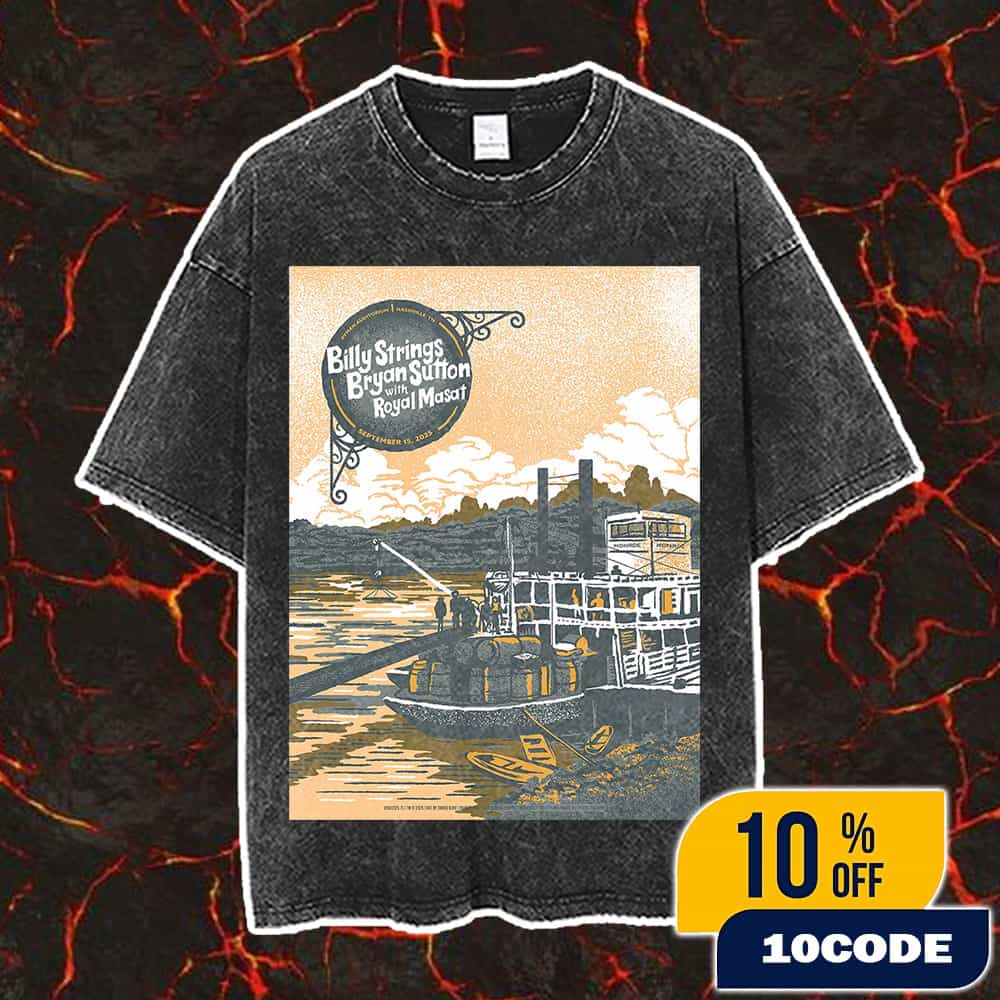The Billy Strings With Bryan Sutton ft Royal Masat On September 15 2025 At Nashville Tennessee Ryman Auditorium Poster Event Artwork By Travis Bone Second Day Washed T-Shirt commemorates the sold-out closing night of Grammy-winning bluegrass phenomenon Billy Strings’ historic two-night residency at the legendary “Mother Church of Country Music” on September 15, 2025, featuring renowned acoustic guitarist Bryan Sutton and bassist Royal Masat in an intimate acoustic collaboration celebrating their album “Live at the Legion” recorded exactly one year prior at Nashville’s American Legion Post 82, with Travis Bone’s (Furturtle) signature vintage riverboat artwork featuring detailed Mississippi steamboat imagery rendered on premium washed fabric. This exclusive second-day washed t-shirt showcases the culmination of the weekend acoustic collaboration where Billy Strings’ innovative psychedelic bluegrass approach meets Bryan Sutton’s masterful flatpicking guitar techniques, highlighting their interpretation of 20 traditional bluegrass and folk songs including Bob Dylan’s “Don’t Think Twice, It’s Alright” and Doc Watson’s “Way Downtown” performed at the 2,362-capacity Ryman Auditorium where country music legends from Johnny Cash to Dolly Parton have graced the same stage since 1892. The washed t-shirt design features Travis Bone’s museum-quality illustration with paddle wheeler steamboat, historic bridges, and scenic waterways in warm golden tones that perfectly captures the traditional roots music aesthetic, created exclusively for this special closing performance with tickets reaching premium secondary market prices due to both shows’ completely sold-out status and the rare opportunity to witness this acoustic supergroup collaboration. Perfect for collectors of band merchandise and bluegrass music enthusiasts seeking premium wearable art from the final night, this second-day washed t-shirt represents the artistic maturity of Billy Strings’ Grammy-nominated career alongside Bryan Sutton’s decades of experience backing artists like Chris Thile and Ricky Skaggs, documented through Travis Bone’s artwork that has become synonymous with Billy Strings’ official tour merchandise collection. This exclusive Ryman Auditorium second-night washed t-shirt embodies the intersection of traditional bluegrass heritage with modern artistic vision, making it an essential wearable collectible for fans who appreciate both the historic significance of Nashville’s most sacred music venue and the innovative musicianship of these acclaimed performers who continue to elevate acoustic music to new artistic heights through their collaborative interpretation of American folk traditions during this landmark weekend performance.