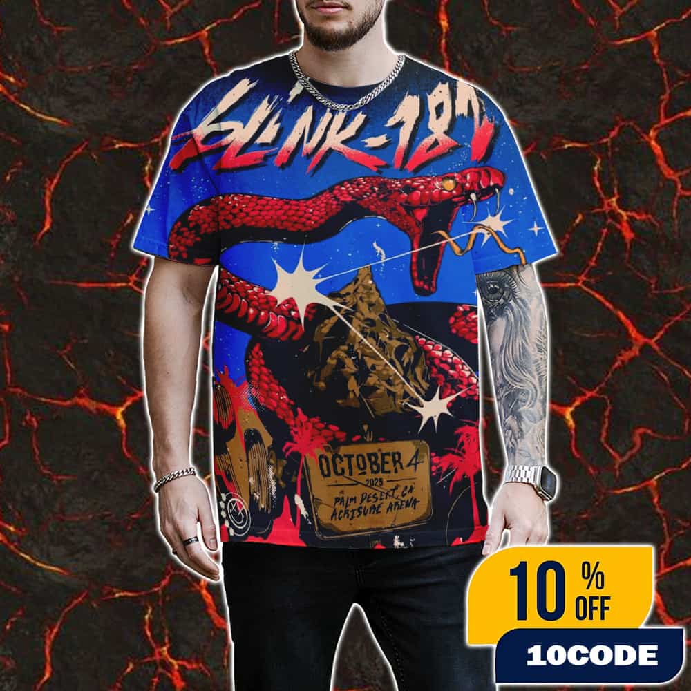This official all over print graphic t-shirt and hoodie commemorates blink-182’s Missionary Impossible Tour 2025 performance at Acrisure Arena in Thousand Palms, California, on October 4, 2025, featuring exclusive artwork by renowned poster artist Cristian Alarcon D. The merchandise celebrates the legendary pop-punk trio’s historic return with original members Mark Hoppus, Tom DeLonge, and Travis Barker performing their punk-fueled setlist that spans their entire catalog, including #1 hits “Edging” and “One More Time” from their latest reunion album “One More Time…”. This Acrisure Arena show marked a special stop on the tour where blink-182 was joined by special guests Alkaline Trio and Landon Barker, bringing their high-energy live performance to fans in Greater Palm Springs with tickets ranging from $62 to $186 depending on seating options. The design features Cristian Alarcon D’s distinctive artistic style, who created the official event poster for this specific concert date, making this apparel a collectible piece for fans attending the show or celebrating blink-182’s influential legacy in punk rock. This wearable merchandise serves as both a fashion statement and a commemorative item for one of the most anticipated tour stops of the Missionary Impossible Tour, which followed the band’s blockbuster 2024 stadium tour and showcased their continued dominance in the alternative music scene.