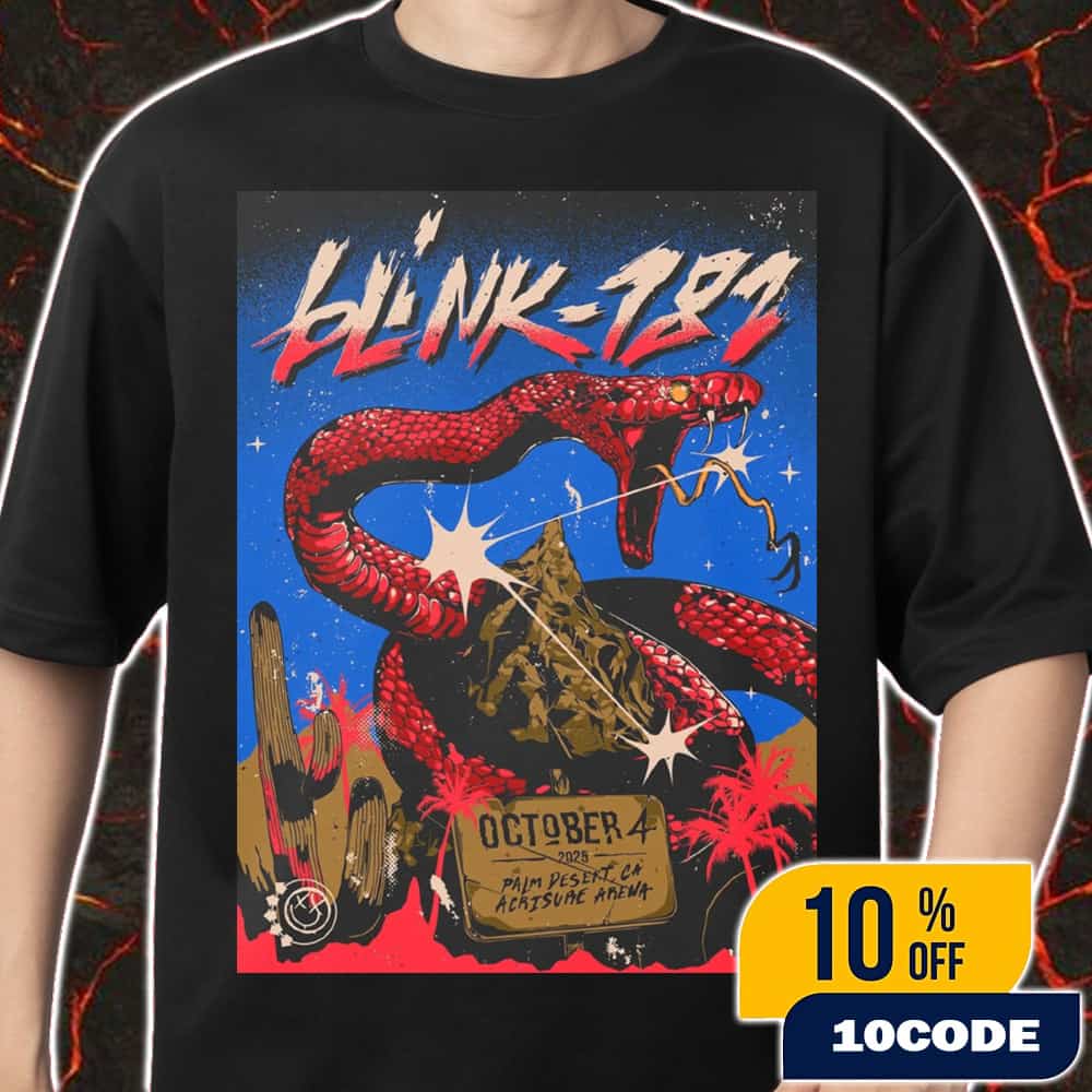 This exclusive Blink-182 Missionary Impossible Tour 2025 unisex t-shirt commemorates the iconic pop-punk trio’s high-energy performance at Acrisure Arena in Thousand Palms (Palm Desert), California, on October 4, 2025, featuring an original event poster design by artist Cristian Alarcon D. The Missionary Impossible Tour, running from August 28 through October 5, 2025, marks a triumphant return for the reunited classic lineup of Mark Hoppus, Tom DeLonge, and Travis Barker as they celebrate their #1 Billboard 200 album “One More Time…” released in October 2023, which achieved the highest total number of weeks spent at number one on the Alternative Airplay charts with thirty-three weeks. This California desert show at the 11,000-capacity Acrisure Arena featured special guests Alkaline Trio and Landon Barker, with the band performing a nostalgia-fueled setlist packed with punk classics spanning their entire catalogue including hits like “All the Small Things,” “What’s My Age Again?,” and “Dammit,” alongside deep cuts from albums like “Dude Ranch,” “Take Off Your Pants and Jacket,” and “Neighborhoods” that haven’t been performed live in decades. The October 4th date was one of two back-to-back performances at Acrisure Arena due to overwhelming fan demand, with the October 5th show serving as the final performance of the entire Missionary Impossible Tour. This official tour merchandise captures the raw punk energy and intimate venue atmosphere of blink-182’s 2025 desert performance, making it an essential collectible for fans who attended the show or want to commemorate this milestone moment in the band’s legendary three-decade career.