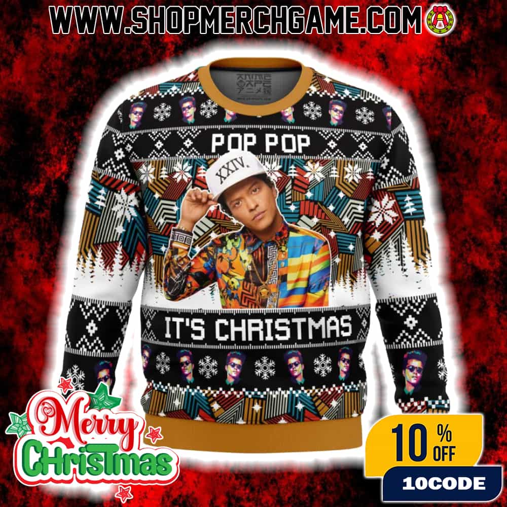 This Bruno Mars Pop Pop It’s Christmas Ugly Christmas Sweater Funny Retro Holiday Knit Pullover celebrates the Grammy-winning superstar who dominated 2024-2025 charts with chart-topping collaborations including “Die With a Smile” featuring Lady Gaga, which spent 18 weeks at #1 on Billboard Global 200 and won Best Pop Duo/Group Performance at the 67th Annual Grammy Awards, and “APT.” with BLACKPINK’s Rosé, which reached #3 on the US Billboard Hot 100 and became the fastest song by a K-pop artist to reach one billion Spotify streams after its October 18, 2024 release. The festive knitwear design pays homage to Bruno Mars’ phenomenal streaming success as he broke Spotify’s all-time record with 140 million monthly listeners during the 2024 holiday season, fueled by his timeless Christmas classics and viral contemporary hits that dominated global playlists. This retro-style ugly Christmas sweater merchandise captures the funky, feel-good spirit of Bruno Mars’ signature sound, which includes his third studio album “24K Magic” (2016) that won Record of the Year at the 2018 Grammy Awards and sold five million units worldwide with platinum-certified hits like “That’s What I Like” and the title track “24K Magic”. Perfect for fans celebrating the holiday season while honoring the multi-Grammy winner’s unprecedented chart dominance across 2024-2025, this collectible pullover represents Bruno Mars’ evolution from his R&B and funk-influenced solo work to becoming a collaborative force with both Western and K-pop superstars, cementing his status as one of music’s most versatile and commercially successful artists.