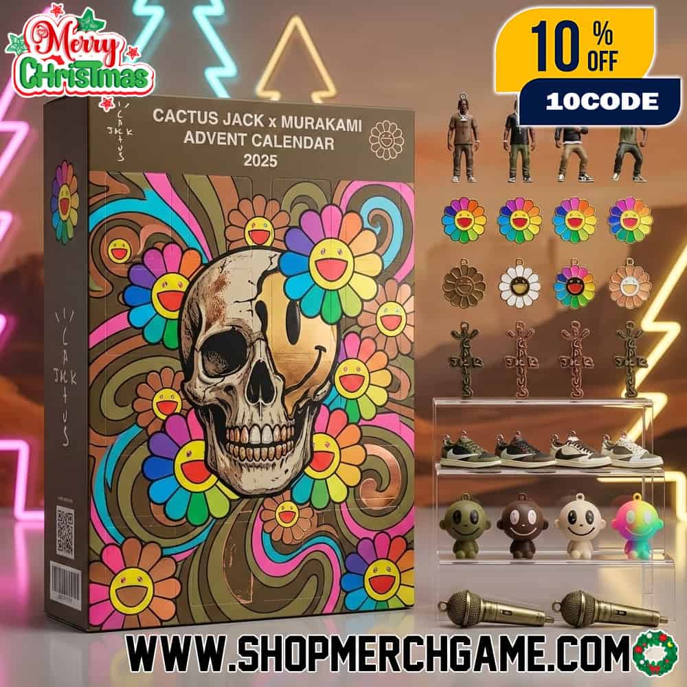 Cactus Jack x Takashi Murakami Advent Calendar 2025 Ornament Box Travis Scott Skull Flower Artwork Mini Figures Sneakers Microphone Collectible Holiday Gift