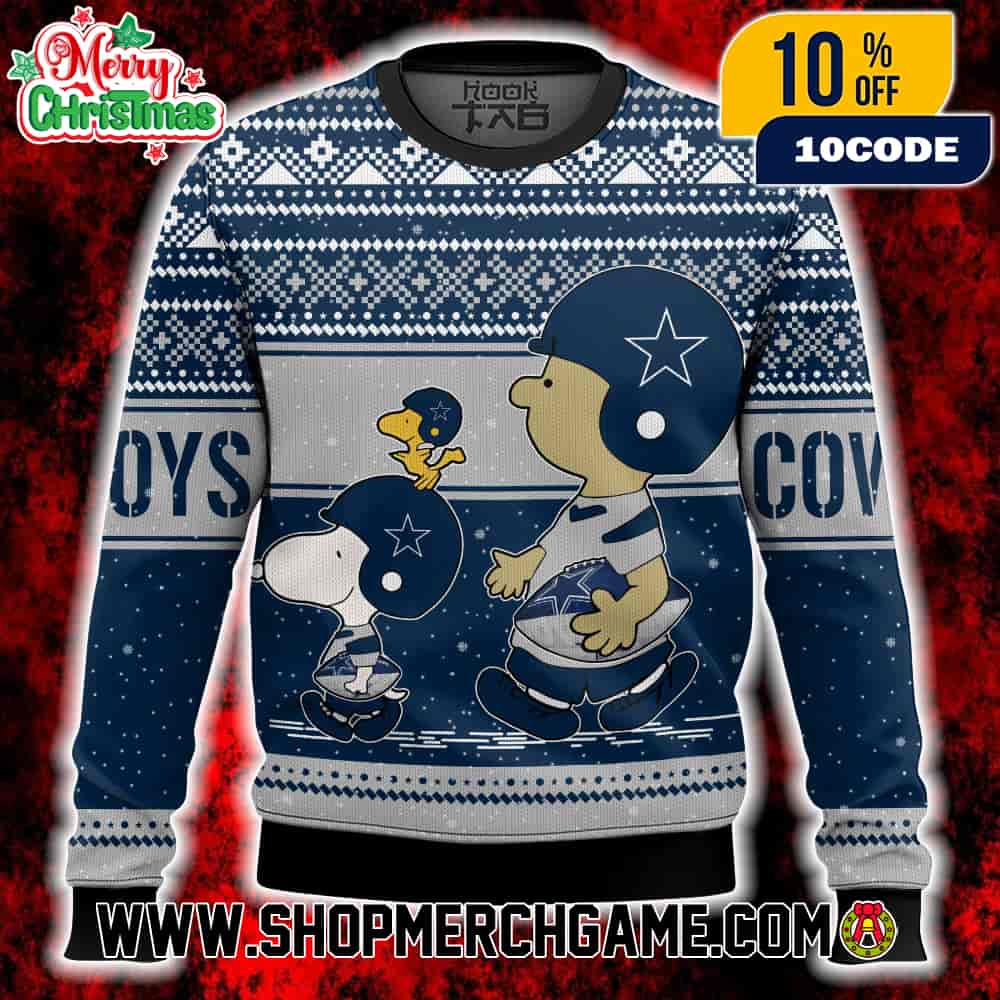 Dallas Cowboys Snoopy Charlie Brown Ugly Christmas Sweater Peanuts NFL Football Holiday Knit With Fair Isle Pattern Snowflakes Winter Festive Gift For Fans
