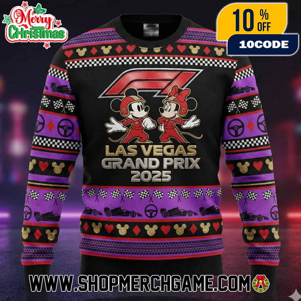 Disney x F1 Las Vegas Grand Prix 2025 Ugly Christmas Sweater Mickey Minnie Mouse Racing Holiday Knit Pullover Gift For Formula 1 Fans