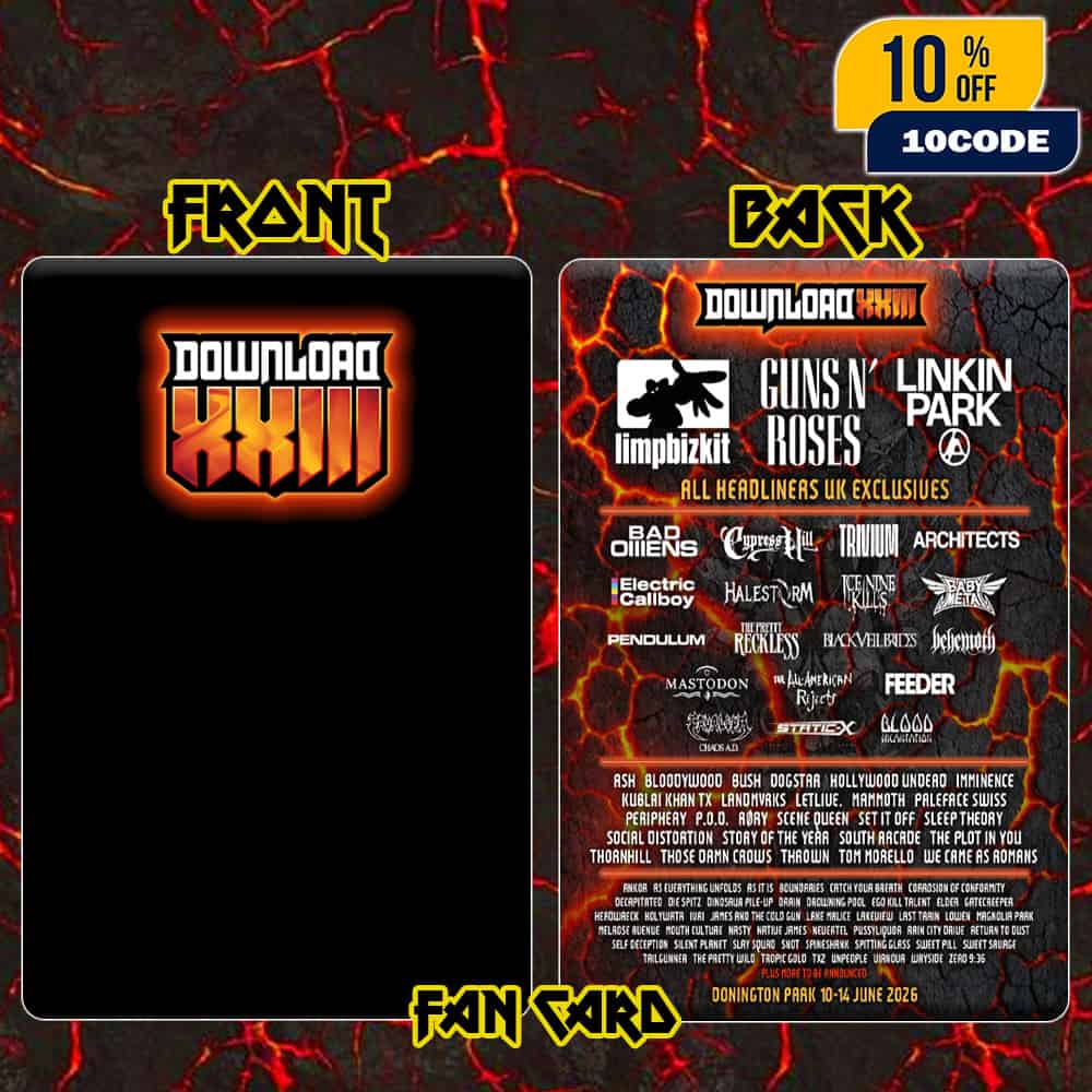 Download Festival XXIII With Main Headline Guns N' Roses x Linkin Park x Limpbizkit And More At Donington Park 10-14 June 2026 Event Poster Lineup Reveal Fan Card