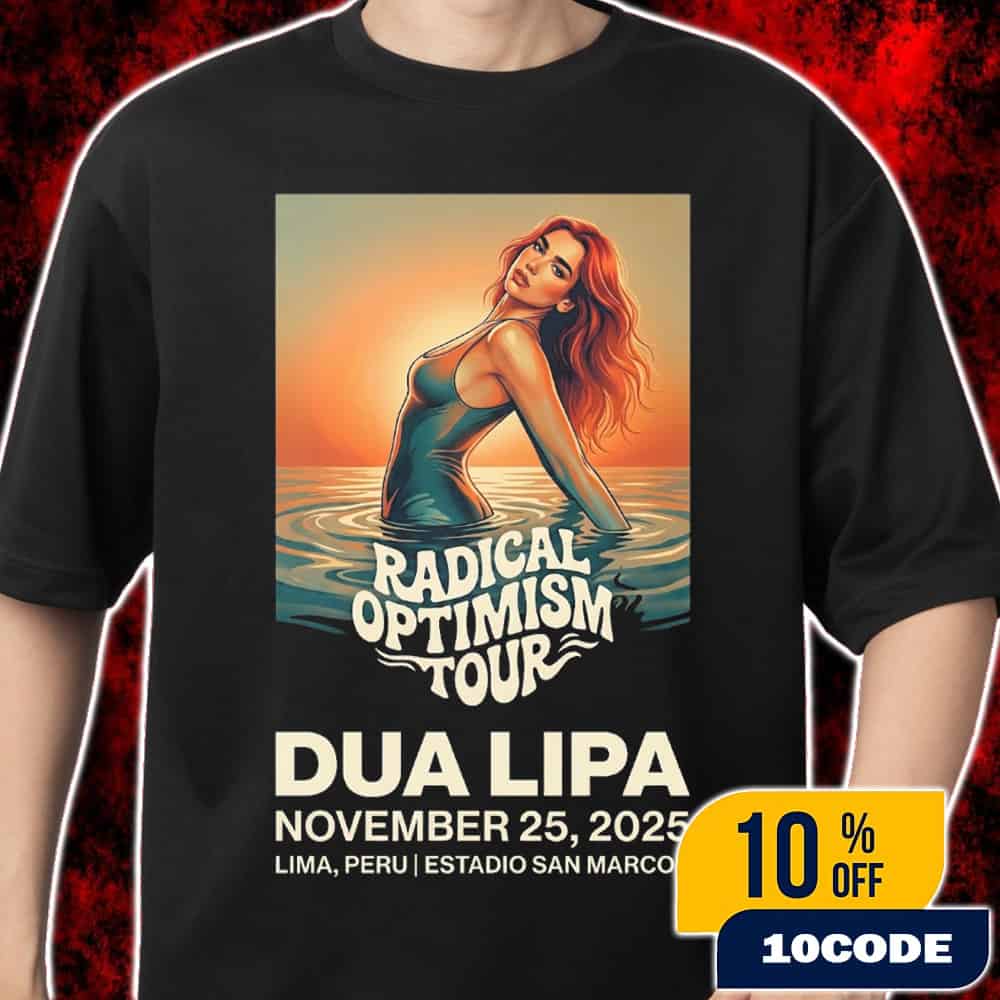 The Dua Lipa Radical Optimism Tour Lima Peru November 25 2025 Estadio San Marcos Concert Poster Art Merch Unisex T-Shirt commemorates Dua Lipa’s much-anticipated live performance in Lima at Estadio San Marcos on November 25, 2025, as part of her globally acclaimed Radical Optimism Tour’s Latin America leg. This exclusive event draws fans from across Peru and South America for a spectacular evening, with official tour merchandise featuring vivid sunset artwork and unique poster designs marking the pop superstar’s only show in Lima, scheduled to start at 7:30 PM local time. The unisex t-shirt showcases the tour’s signature visuals inspired by Dua Lipa’s energetic stage persona, with premium quality prints available at the stadium and through select retailers, providing fans and collectors with a limited-edition souvenir from one of 2025’s top international music events. Tickets for the Lima concert range from $63 to $69, with secure purchase options and VIP packages available online, giving attendees access to official event memorabilia and exclusive merchandise bundles. This concert and its associated merch represent a major celebration for Dua Lipa fans in Lima, delivering world-class pop music and authentic, artist-approved collectibles tied to the Radical Optimism Tour’s global sensation.
