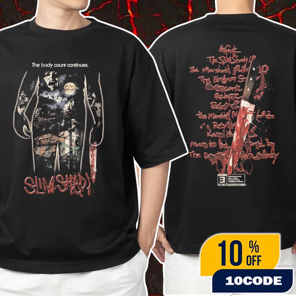 The Eminem Slim Shady Massacre Capsule Body Count New Halloween 2025 Merch Collection unisex t-shirt merchandise represents the latest limited-edition Halloween release from Detroit rap legend Eminem, featuring bold “Body Count” graphics that celebrate his menacing Slim Shady alter ego with horror-inspired imagery and continuing his successful tradition of seasonal collections like the 2023 Shady Rated R Collection that featured exclusive 48-hour drops including Slim Shady Hockey Mask designs and Terror Continues graphic apparel. This premium unisex t-shirt from the exclusive Slim Shady Massacre Capsule showcases provocative graphics referencing the violent, controversial lyrical content that defined Eminem’s groundbreaking career since his 1999 major-label debut “The Slim Shady LP,” which won the Grammy Award for Best Rap Album and revolutionized hip-hop with its shocking, horror-themed storytelling, dark humor, and fictional narratives about murder and mayhem that made him one of the most controversial artists in music history. The design reflects Eminem’s established merchandising strategy of releasing collectible capsule collections for major cultural moments and seasonal celebrations, similar to his Super Bowl LVI Halftime Show Shady Football Capsule in February 2022 and the Marshall Mathers LP 25th Anniversary Merch collection dropped in May 2025 commemorating the fastest-selling solo album in United States history. Eminem’s official merchandise releases consistently feature premium cotton-poly blend materials, provocative graphics inspired by his multi-platinum albums and controversial Slim Shady persona known for violent lyrical content, limited availability windows that create collector urgency, and designs celebrating his unparalleled status as one of the best-selling music artists of all time with over 220 million records sold globally, 15 Grammy Awards, an Academy Award for “Lose Yourself,” and recognition as one of the greatest and most influential rappers in history. This Halloween t-shirt serves as both edgy streetwear and a collectible piece of hip-hop memorabilia, representing Eminem’s cultural dominance through horror-themed seasonal merchandise that showcases the dark, twisted personality of Slim Shady and the violent lyrical “body count” that made him one of the most successful and controversial artists in popular music while pushing artistic boundaries and challenging societal norms.