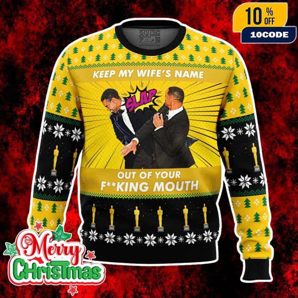 This Funny Will Smith Chris Rock Slap Holiday Knit Pullover Meme Ugly Sweater immortalizes one of the most shocking and instantly viral moments in Academy Awards history, commemorating the unprecedented incident that occurred on March 27, 2022, during the 94th Oscars ceremony at the Dolby Theater in Hollywood when Will Smith walked onto the stage and slapped presenter Chris Rock in response to an unscripted joke about Jada Pinkett Smith’s shaved head caused by alopecia, creating a cultural phenomenon that overshadowed the entire ceremony and became one of the most-viewed online videos within 24 hours. This meme-inspired Christmas sweater transforms the infamous moment into festive holiday humor, featuring cartoon-style illustrations of the slap alongside traditional Christmas elements like snowflakes, holly, and holiday patterns, capturing the absurdity of the incident that left Rock visibly shocked and prompted Smith to shout “Keep my wife’s name out of your f***ing mouth” before later winning the Best Actor Oscar for “King Richard” that same evening. The ugly sweater celebrates the incident’s immediate transformation into internet meme culture, referencing the viral catchphrases, social media reactions, and countless parody videos that emerged following the uncensored international footage that spread worldwide, while Smith subsequently faced a 10-year ban from all Academy events, resigned his Academy membership, and issued multiple public apologies to Rock and the Academy. Crafted from comfortable acrylic knit fabric with vibrant, fade-resistant printing that captures the dramatic expressions and body language of both celebrities during the confrontation, this conversation-starting pullover serves as the perfect icebreaker for Christmas parties, holiday gatherings, or pop culture enthusiasts who appreciate how quickly serious Hollywood moments can become comedic internet phenomena. Available through specialty meme merchandise retailers and custom apparel stores, this collector’s edition holiday sweater allows wearers to showcase their appreciation for viral culture moments while participating in the ongoing conversation about celebrity behavior, accountability, and the intersection of serious issues with internet humor, representing how a single moment of poor judgment can instantly become part of popular culture lexicon and holiday fashion.