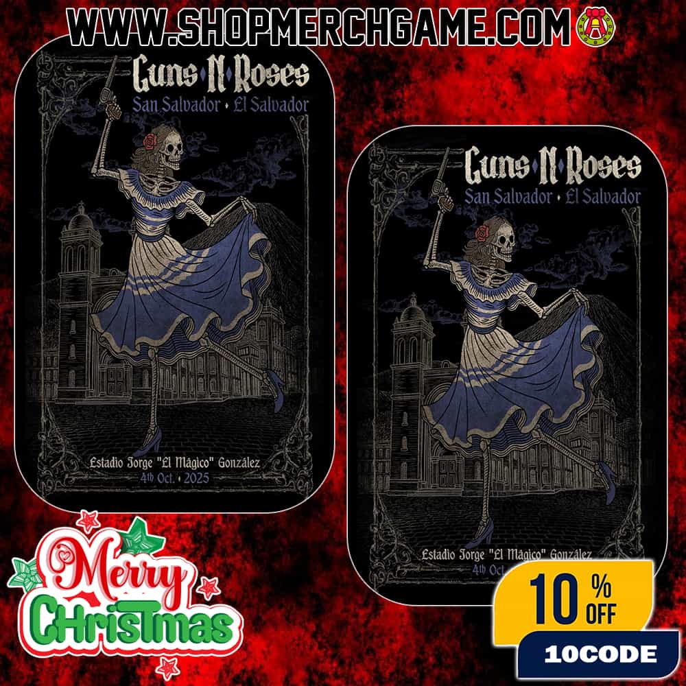 This exclusive Guns N’ Roses event poster commemorates the legendary rock band’s electrifying performance on October 4, 2025, at Estadio Jorge “El Mágico” González in San Salvador, El Salvador, as part of their massive “Because What You Want & What You Get Are Two Completely Different Things Tour”. The show marked Guns N’ Roses’ triumphant return to El Salvador after 15 years, delivering an unforgettable setlist featuring classic hits like “Welcome to the Jungle,” “Sweet Child O’ Mine,” “November Rain,” and fan favorites such as “Chinese Democracy,” “Slither,” and covers of “Wicked Game” and “The Seeker” during their 8:00 PM performance. This Latin American leg of the 2025 world tour showcases the iconic lineup of Axl Rose on lead vocals, Slash on lead guitar, Duff McKagan on bass, Richard Fortus on rhythm guitar, Dizzy Reed on keyboards, Melissa Reese on synthesizers, and new drummer Isaac Carpenter, bringing the authentic Guns N’ Roses experience to Central and South American audiences across 13 stadium shows. The artwork features La Catrina-inspired design elements that celebrate the cultural fusion of rock music and Latin American heritage, making this poster a must-have collectible for die-hard GNR fans and concert memorabilia enthusiasts who want to preserve this historic musical moment. Available exclusively at shopmerchgame.com, this official fan card serves as both a stunning display piece and a tangible memory of one of rock’s most legendary bands performing in one of Central America’s premier sports venues, which has hosted major international concerts and sporting events throughout its storied history.