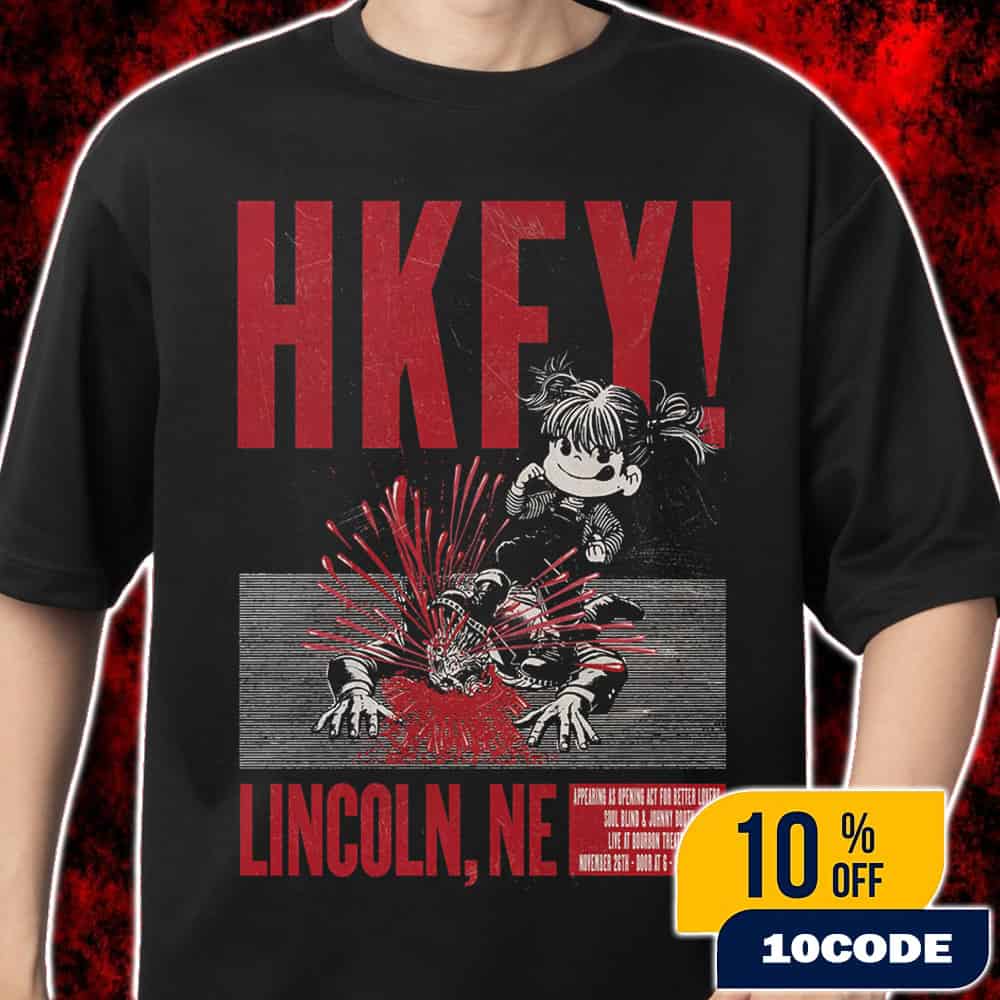 The HKFY November 26 2025 Lincoln NE Concert Poster T-Shirt commemorates a high-energy metalcore show at the Bourbon Theatre in Lincoln, Nebraska, featuring an explosive lineup of Hong Kong Fuck You, Soul Blind, Johnny Booth, and headliners Better Lovers as part of the Better Lovers US 2025 Tour that kicked off on November 13 in Greensboro, North Carolina. This all-ages show, with doors opening at 7:00 PM and tickets priced at $29, represents a key stop on Better Lovers’ tour leading up to their annual BLISSMAS ’25 holiday event, bringing the metalcore supergroup’s intense performances to the Midwest alongside some of the genre’s most compelling supporting acts. The unisex t-shirt features red and black event flyer artwork showcasing the November 26th date, venue information, and complete band lineup, capturing the raw aesthetic of underground metal show posters while serving as official tour merchandise for fans who attended the Bourbon Theatre performance or want to represent this convergence of heavy music talent in Nebraska’s capital city. Hong Kong Fuck You, known for their aggressive sound and uncompromising stage presence, joined this tour package that stopped at venues across the United States from Florida to New Hampshire between November 2025 and January 2026, making this shirt a collectible piece of tour memorabilia from a night when four of metalcore’s most exciting acts shared one stage.