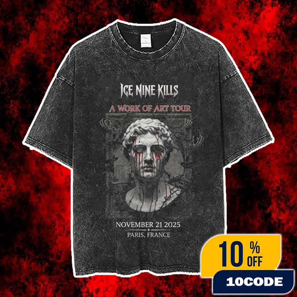 The Ice Nine Kills A Work Of Art Tour On November 21 2025 At Paris France Beauty vs Brutality Artwork City Event Tee Vintage Washed Unisex T-Shirt commemorates the Massachusetts horror-metalcore legends’ sold-out performance at the historic Salle Pleyel in Paris, France on Friday, November 21, 2025, at 7:00 PM as part of their extensive “A Work of Art Tour 2025” European campaign featuring special guests The Devil Wears Prada and British horror-punk band Creeper. This premium vintage washed tee features the “Beauty vs Brutality” artwork theme that captures Ice Nine Kills’ signature duality of theatrical horror aesthetics and crushing metalcore intensity, celebrating a show at the prestigious Salle Pleyel located at 252 Rue du Faubourg Saint-Honoré in Paris’s 8th arrondissement—a renowned concert hall known for hosting classical performances that provided a striking contrast to Ice Nine Kills’ horror-themed extreme metal spectacle. The Paris date represents a crucial European stop following the tour’s November 19 kickoff in Milan and November 20 performance in Zurich, before continuing to Vienna (November 23), Munich (November 24), Brussels (November 26), Cologne (November 27), Prague (November 28), Leipzig (November 30), Warsaw (December 1), Berlin (December 2), Hamburg (December 4), Tilburg (December 5), Frankfurt (December 6), and culminating at London’s OVO Arena Wembley on December 12, 2025. The show’s setlist likely featured Ice Nine Kills’ horror-inspired theatrical metalcore including tracks from their breakthrough albums The Silver Scream (2018) and The Silver Scream 2: Welcome to Horrorwood (2021) such as the gold-certified single “A Grave Mistake,” plus “A Work of Art”—the official song from Terrifier 3, the highest-grossing unrated film ever—alongside fan favorites like “Red Right Hand,” “Meat & Greet,” “Funeral Derangements,” “Hip to Be Scared,” “Ex-Mørtis” (inspired by Evil Dead), and encore performances showcasing frontman Spencer Charnas’s versatile vocals, theatrical performances, and the band’s elaborate stage production featuring horror-themed props, cinematic video projections, and costume changes. The vintage washed treatment creates a lived-in, tour-worn aesthetic that reflects Ice Nine Kills’ extensive 2025 touring campaign including support dates with Slipknot, being handpicked by Metallica for the M72 World Tour (2022-2025), major festival appearances at When We Were Young Festival in Las Vegas, and the annual Silver Scream Convention in Worcester, Massachusetts near the band’s North Shore birthplace. The t-shirt joins Ice Nine Kills’s extensive official merchandise catalog including vinyl pressings like “A Work of Art” Orange 7″ ($25), “I Heard They KILL Live 2” Swamp Thing Green Vinyl ($30), “Welcome to Horrorwood: The Silver Scream 2” album ($30), “The Predator Becomes The Prey” Opaque White Vinyl ($25), “Every Trick In The Book” Opaque White Vinyl ($25), limited edition Horrorwood Reserve whiskey collaboration with Matthew Lillard (Scream), and the monthly “Nightmare on the 9th” merch drops that keep the INKverse engaged between tours. The Paris show sold out months in advance, reflecting Ice Nine Kills’ explosive European fanbase growth and their position as horror-metalcore’s premier act led by Spencer Charnas—whose creative vision has expanded beyond music into the Psychos Only club, mock “true crime” book, Inked in Blood graphic novels, Pretty Evil personal care line, and The Slashin’ of the Christ feature film co-written with Paul Soter (Super Troopers) and produced by Greg Nicotero (The Walking Dead). The “Beauty vs Brutality” artwork captures the band’s core identity of transforming iconic horror films and literature into visceral musical experiences through albums that reference Friday the 13th, A Nightmare on Elm Street, The Texas Chain Saw Massacre, Psycho, The Crow, American Psycho, Evil Dead, Candyman, and other genre classics, offering fans wearable commemoration of a historic sold-out Paris performance that showcased Ice Nine Kills at the peak of their creative and commercial powers as they continue expanding their “Horrorwood” universe through music, merchandise, and multimedia experiences that bridge extreme metal with Hollywood horror.