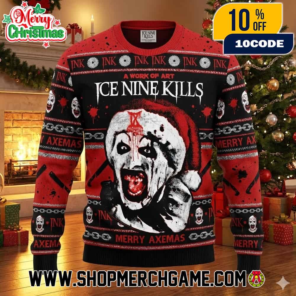 Ice Nine Kills A Work Of Art Ugly Christmas Sweater Red Black Knit Pullover Art The Clown Terrifier Merry Axemas Horror Metalcore Holiday Winter Xmas Unisex