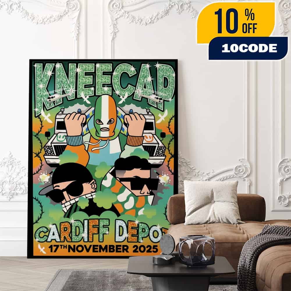 The Kneecap Live At Cardiff Depot 17th November 2025 Concert Poster Irish Hip Hop Band Trio Live Design Poster Canvas Home Decor commemorates the highly anticipated sold-out performance by Belfast’s most provocative rap trio at DEPOT Cardiff on Monday, November 17, 2025, scheduled from 7:00 PM to 11:00 PM as part of their explosive November 2025 European tour. This official concert poster captures the electrifying energy of Kneecap, the groundbreaking Irish-language hip hop group consisting of MCs Móglaí Bap and Mo Chara alongside DJ Provaí, who have become the most talked-about act on the planet following their legendary 2025 Coachella performance, sold-out tours across the UK, US, Australia, and New Zealand, and triumphant festival appearances at Glastonbury, Reading and Leeds, Sziget, and Electric Picnic. The trio from West Belfast emerged from the underground Irish hip hop scene in 2018, gaining international recognition for their unique blend of Irish Gaeilge and English lyrics addressing themes of Irish language rights, working-class life, drugs, drink, and political commentary with provocative humor and rebellious spirit, exemplified in their debut track inspired by Irish language rights activism. Tickets for the Cardiff show went on presale Thursday July 17th at 10 AM and general sale Friday July 18th at 10 AM, selling out in seconds due to overwhelming demand following the success of their debut album “Fine Art” and their work on a highly anticipated follow-up. The venue enforces an 18+ age restriction, requires ID, operates cashless bars, has a casual but not scruffy dress code (no tracksuits or caps allowed), and offers cloakroom service for £3, with set times announced closer to the event. Following their 2024 breakout year that included multiple sold-out tours and a free outdoor Melbourne show attended by over 10,000 fans, Kneecap has solidified their position as underground legends turned mainstream phenomenon, with upcoming performances at Wembley Arena in London and two massive concerts at Dublin’s 3Arena, Ireland’s largest indoor venue. This limited-edition concert poster serves as essential memorabilia for fans of the revolutionary Irish hip hop movement, featuring the band’s distinctive luchador mask-inspired branding in vibrant green, orange, and white colors that reflect Irish heritage, making it perfect canvas home decor for collectors of contemporary Irish music history and supporters of the Irish language revival movement championed by Kneecap’s politically charged artistry.