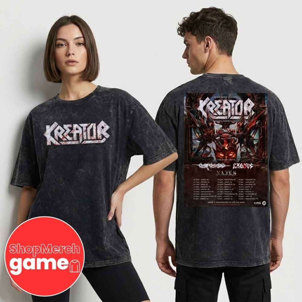 The Kreator Krushers of the World UK and Europe Tour 2026 Two Sides Acid Washed T-Shirt commemorates one of the most anticipated extreme metal tours of the decade, featuring German thrash titans Kreator alongside an unprecedented lineup of legendary support acts—British death metal pioneers Carcass, Bay Area thrash innovators Exodus, and California powerviolence destroyers Nails. Kreator, the Essen, Germany-based thrash metal institution formed in 1982, released their sixteenth studio album Krushers of the World on January 16, 2026, coinciding with this massive European campaign that launched on March 20, 2026, at the MEO Arena in Lisbon, Portugal, and will devastate 20 countries across Europe and the United Kingdom through its finale on April 25, 2026, at Poolen in Copenhagen, Denmark. The tour represents a historic convergence of extreme metal’s most influential forces, with Kreator’s legendary discography including genre-defining albums like Pleasure to Kill (1986), Terrible Certainty (1987), Extreme Aggression (1989), and Coma of Souls (1990) establishing them as Teutonic thrash metal royalty with fifteen studio albums to their name. Liverpool’s Carcass, formed in 1985, brings their surgical precision and death metal mastery honed across seven studio albums, with founding members Bill Steer and Jeff Walker continuing their groundbreaking work that redefined extreme music aesthetics. Exodus, credited as pioneers of the Bay Area thrash metal scene and members of thrash metal’s elite “Big Eight” alongside Metallica, Megadeth, and Slayer, have sold over five million albums worldwide and are often acknowledged as the first Bay Area thrash band to exist, predating even Metallica’s formation in the region. Completing this devastating four-band assault, Oxnard, California’s Nails unleashes their hybrid sonic violence blending grindcore, powerviolence, hardcore punk, and death metal, with their 2024 album Every Bridge Burning demonstrating the relentless intensity that has made them indispensable to modern extreme music since their 2007 formation. The tour’s UK dates include a historic March 27, 2026, performance at London’s O2 Academy Brixton—Kreator’s largest-ever headline show in the British capital—followed by Manchester’s O2 Apollo on March 28 and Glasgow’s O2 Academy on March 29, with additional European stops including iconic venues like Zenith Paris, Alcatraz Milan, Forum Karlín Prague, and Uber Eats Music Hall Berlin. This premium acid-washed t-shirt features tour dates and artwork on both sides, serving as essential memorabilia from a tour that metal historians will recognize as a defining moment when four generations of extreme metal excellence united for an unparalleled celebration of sonic aggression and uncompromising artistic vision.