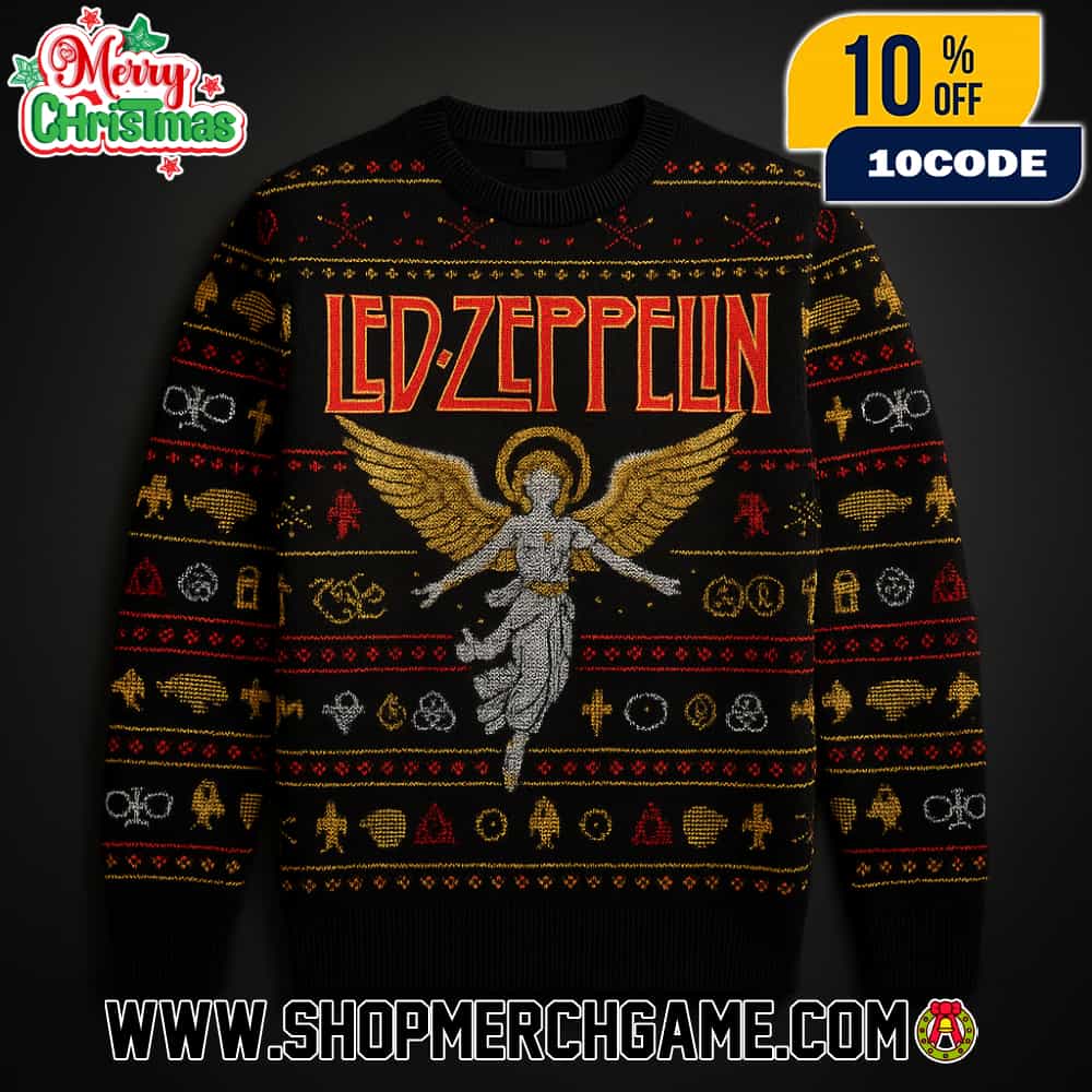 Led Zeppelin Ugly Christmas Sweater Black Knitted Crew Neck Angel Wings Red Gold Fair Isle Holiday Band Pullover Merch