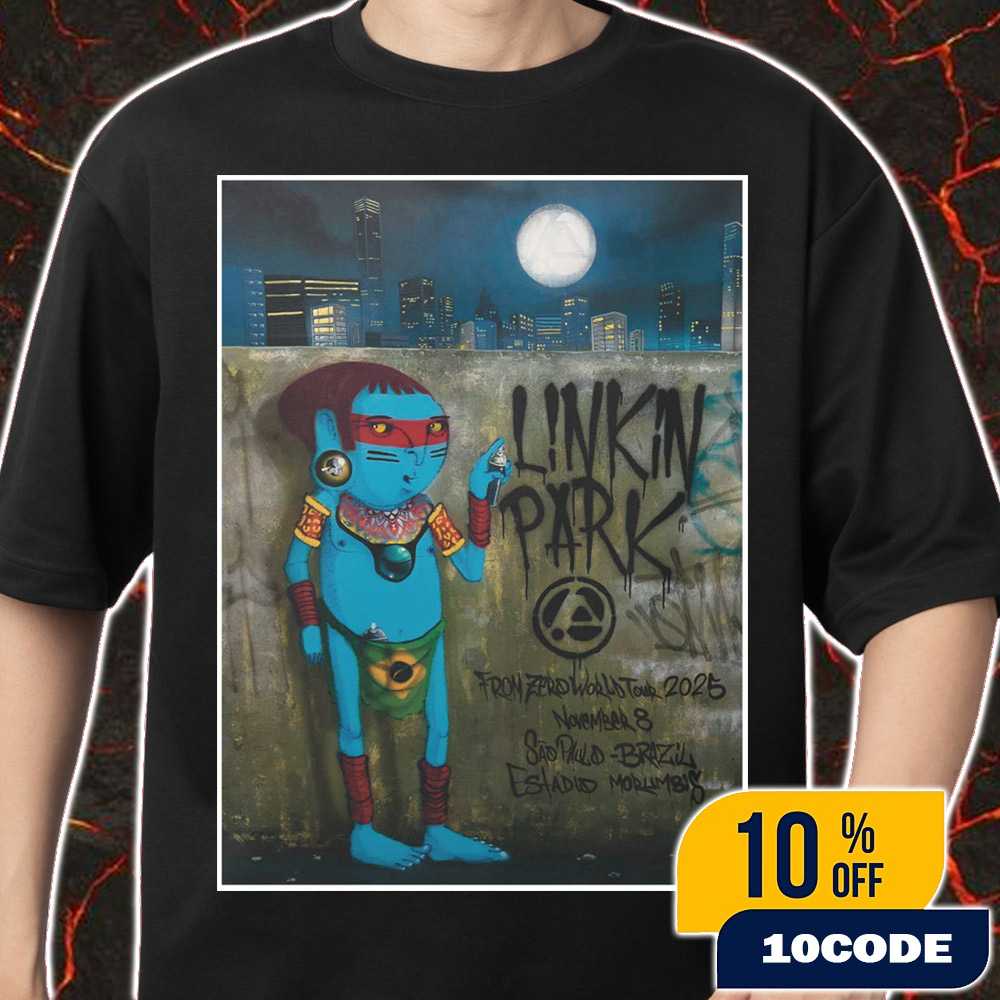 The Linkin Park From Zero World Tour Sao Paulo Event Poster Version 2 November 8th 2025 Artwork By Cranio Merch Unisex T-Shirt celebrates one of the most anticipated concert events of 2025, featuring the iconic American rock band’s historic return to Estádio MorumBIS in São Paulo, Brazil, a legendary venue with a capacity of 66,795 that holds special significance as the location of Linkin Park’s memorable 2004 performance during their first South American show. This exclusive merchandise commemorates the November 8, 2025 concert as part of the extensive From Zero World Tour, the band’s first tour in seven years following their hiatus, now featuring new lead vocalist Emily Armstrong alongside founding members Mike Shinoda, Dave “Phoenix” Farrell, and Joe Hahn, while supporting their eighth studio album “From Zero” released in November 2024. The striking artwork is created by Cranio (born Fabio de Oliveira Parnaiba in 1982, São Paulo), one of Brazil’s most celebrated urban artists who began transforming the gray walls of his hometown with vibrant street art in 1998 and has since exhibited his work in over 20 countries including Paris, London, Berlin, Amsterdam, Chicago, and Miami. Cranio’s signature style blends humor, social critique, and pop culture through his iconic blue Indian character, incorporating influences from cartoons, pop art, and surrealism to explore themes of consumerism, inequality, and environmental concerns, making him the perfect artistic choice for this limited-edition poster design that captures Brazilian identity and cultural vibrancy. The concert takes place at the renamed MorumBIS stadium (formerly Estádio Cícero Pompeu de Toledo), located at Praça Roberto Gomes Pedrosa, 1 in the Morumbi district, with doors opening at 4:00 PM and the show beginning at 9:00 PM, featuring special guest Poppy as the opening act for the South American leg of the tour. Tickets for the São Paulo show start at approximately $70, with various VIP packages available including the From Zero Premium Experience, Overflow Early Entry, Heavy is the Crown, and The Emptiness Machine packages ranging from $273 to $610, offering exclusive benefits such as early venue access, premium seating, and commemorative merchandise. The From Zero World Tour spans five continents with over 50 stadium and arena shows throughout 2025, featuring an electrifying setlist that combines new tracks from the “From Zero” album like “The Emptiness Machine,” “Heavy Is the Crown,” “Two Faced,” and “Overflow” with timeless classics including “In the End,” “Numb,” “Faint,” “Crawling,” “One Step Closer,” and “Bleed It Out,” reimagined with Armstrong’s powerful vocal delivery. This unisex t-shirt serves as an authentic piece of music memorabilia that connects fans to both Linkin Park’s legendary musical legacy spanning over two decades and Brazil’s thriving contemporary art scene through Cranio’s distinctive visual storytelling, making it a must-have collectible for dedicated followers of the band and supporters of the From Zero era who want to commemorate this historic stadium performance in one of South America’s most iconic concert venues.