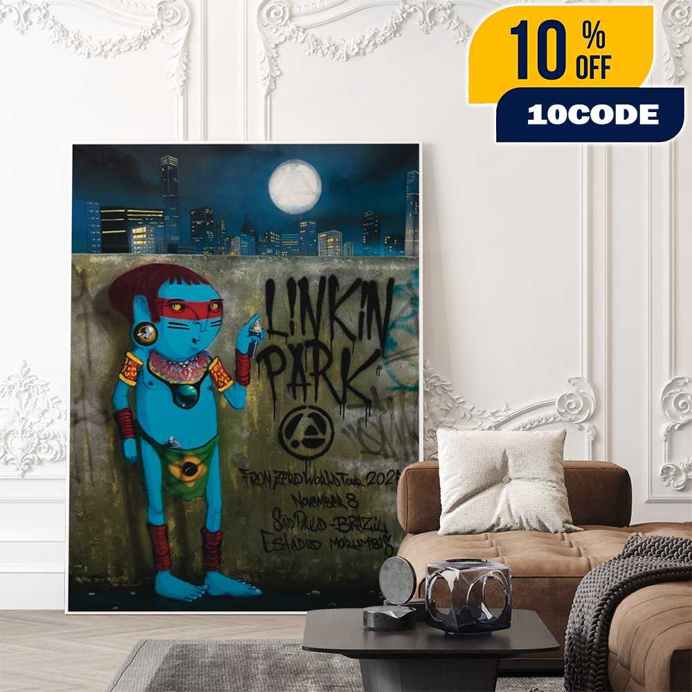 The Linkin Park From Zero World Tour Sao Paulo Event Poster Version 2 November 8th 2025 Artwork By Carnio Poster Canvas Home Decor represents the second limited-edition commemorative poster for the band’s landmark performance at Estádio MorumBIS (Morumbi Stadium) in São Paulo, Brazil on Saturday, November 8, 2025, featuring exclusive original artwork commissioned from renowned Brazilian street artist Cranio (Fabio de Oliveira Parnaíba, b. 1982). Cranio is celebrated as one of Brazil’s leading urban artists, internationally recognized for his signature cerulean blue indigenous character that symbolically blends humor, social critique, and pop culture to explore themes like consumerism, inequality, and environmental issues, with his vibrant work displayed in murals and exhibitions across over 20 countries including Paris, London, Berlin, Amsterdam, Chicago, and Miami. This hand-numbered Version 2 poster is printed on premium 18″ x 24″ heavy cold press cotton rag 300gsm paper with a deckle edge and available in both unsigned and band-signed editions (limited to only 10 signed copies), shipping beginning January 2025. The São Paulo concert marks Linkin Park’s sixth performance at this legendary venue as part of their historic From Zero World Tour supporting their eighth studio album “From Zero” (2024), featuring new vocalist Emily Armstrong and performing a spectacular five-act setlist spanning 24 songs including “In the End,” “Numb,” “The Emptiness Machine,” and “Heavy Is the Crown”. With concert tickets ranging from R$270 to R$1,250 and doors opening at 4:00 PM, this show represents a monumental return for the band after seven years. This collectible canvas poster serves as premium art-quality memorabilia featuring Cranio’s distinctive aesthetic that captures Brazilian cultural identity through his iconic blue indigenous figures, perfectly embodying the intersection of contemporary music culture and thought-provoking street art that continues to inspire dialogue about transformation and identity.