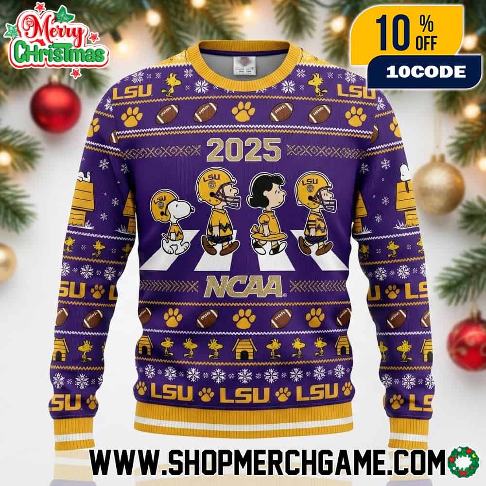 LSU Tigers x Peanuts Snoopy Abbey Road 2025 Ugly Christmas Sweater NCAA Football Knitted Crewneck Purple Gold Holiday Fan Gift