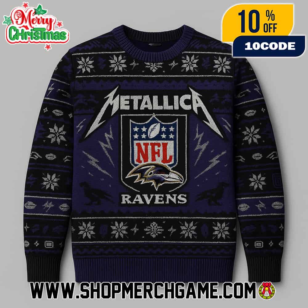 Metallica Baltimore Ravens Ugly Christmas Sweater Unisex Navy Black Knit Holiday Pullover NFL Metal Band Football Mashup Festive Crewneck