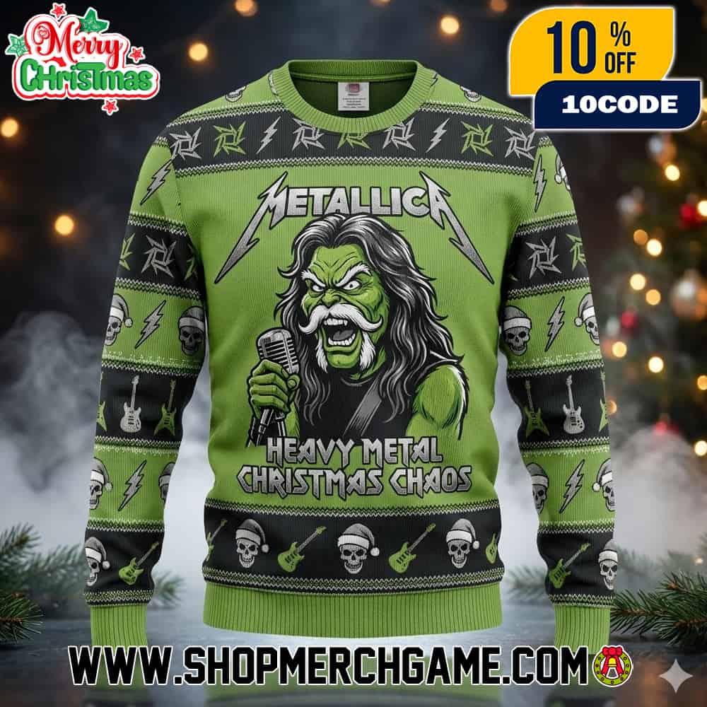 The Metallica Heavy Metal Christmas Chaos Ugly Sweater Green Black Knit Pullover With Grinch Lightning Skulls Guitars Fair Isle Pattern Holiday Festive Winter Jumper celebrates metal legends Metallica’s record-breaking M72 World Tour extending into its third year (2025-2026), with 21 North American shows spanning April-June 2025 before heading to Australia, New Zealand, UAE, and Europe through July 2026, featuring the band’s groundbreaking “No Repeat Weekend” concept where each city experiences two unique setlists in support of their latest album 72 Seasons (April 14, 2023), their eleventh studio album that debuted at #1 in 17 countries and marked their sixth consecutive US chart-topper. Founded in 1981 in Los Angeles by drummer Lars Ulrich and guitarist/vocalist James Hetfield, Metallica has become the world’s most commercially successful heavy metal band with over 125 million albums sold worldwide, revolutionizing thrash metal through legendary albums including Kill ‘Em All (1983), Ride the Lightning (1984), Master of Puppets (1986), …And Justice for All (1988), and the diamond-certified self-titled “Black Album” (1991), earning 9 Grammy Awards and induction into the Rock and Roll Hall of Fame while continuing to dominate with modern classics like Death Magnetic (2008), Hardwired…To Self-Destruct (2016), and 72 Seasons. The official 2025 holiday merch collection, launched October 2025 in the Met Store at Metallica.com, features exclusive festive designs including this creative mashup that merges Dr. Seuss’s beloved Christmas villain the Grinch with Metallica’s signature imagery of lightning bolts (from their iconic “Ride the Lightning” album art), skulls representing the band’s aggressive thrash metal aesthetic, electric guitar silhouettes honoring Hetfield and lead guitarist Kirk Hammett’s legendary riffs, and the Grinch’s anti-Christmas rebellion that perfectly mirrors metal culture’s countercultural spirit. This premium knit pullover showcases Metallica’s green and black color scheme (a nod to both the Grinch’s complexion and the band’s darker aesthetic) rendered in traditional Fair Isle knit patterns with snowflakes, Christmas trees, and holiday motifs that juxtapose festive cheer with heavy metal chaos, creating a humorous contrast between wholesome Christmas tradition and Metallica’s skull-crushing sound epitomized by anthems like “Master of Puppets,” “Enter Sandman,” “One,” “Nothing Else Matters,” and “Seek & Destroy”. Metallica’s M72 World Tour continues to break attendance records across stadium venues including Nashville’s Nissan Stadium, Columbus’ Sonic Temple, Denver’s Empower Field, Athens’ Olympic Stadium, Frankfurt’s Deutsche Bank Park, London’s London Stadium, and Dublin’s Aviva Stadium, with tickets selling out within hours and generating hundreds of millions in revenue while the band maintains its position as one of rock’s highest-grossing live acts and most merchandised brands. This exclusive ugly Christmas sweater serves as the ultimate holiday gift for Metallica fans worldwide preparing for M72 tour dates, metalheads who grew up with the “Big Four” of thrash metal (Metallica, Slayer, Megadeth, Anthrax), ugly sweater party attendees seeking conversation-starting metal-meets-Christmas crossover apparel, and anyone celebrating the intersection of Dr. Seuss nostalgia, California thrash metal history, and festive holiday tradition wrapped in green and black Fair Isle glory featuring Grinch imagery, lightning bolts, skulls, and guitars that honor both Christmas chaos and heavy metal mayhem.