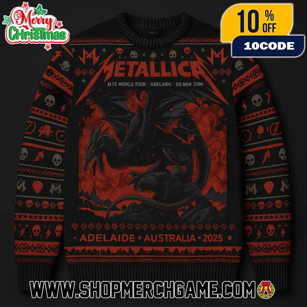 Experience festive holiday spirit with Metallica’s exclusive M72 Adelaide ugly sweater shirt featuring Ken Taylor’s iconic artwork from the legendary November 5, 2025 concert at Adelaide Ovalโa limited-edition pop-up exclusive perfect for Christmas gift-giving and heavy metal fan celebrations. This premium ugly sweater design combines traditional holiday aesthetics with Metallica’s distinctive M72 World Tour visual identity, featuring Ken Taylor’s signature screen-printed poster artwork created specifically for the sold-out Adelaide Oval performance, transforming the concert’s official aesthetic into a wearable collectible that bridges metalhead culture and festive seasonal fashion. Metallica’s November 5, 2025 Adelaide Oval show marked a pivotal moment in the band’s record-breaking M72 World Tour, with the legendary heavy metal pioneers performing at the 55,000+ capacity venue to a sell-out crowd featuring support from Evanescence and Suicidal Tendencies, with gates opening 4:30 PM and the iconic Snake Pit extending from the stage while delivering a career-spanning setlist including “Creeping Death,” “For Whom the Bell Tolls,” “Sad But True,” and material from 72 Seasons. Exclusively available at the official M72 Pop-Up Shop (November 4-6, 2025 at The Queen’s Theatre, Adelaide) and select authorized retailers, this ugly sweater shirt features premium construction with fade-resistant inks, unisex sizing, and Taylor’s distinctive visual design reflecting the official concert poster aesthetic alongside playful holiday-themed embellishments. Perfect for Christmas gift-giving to devoted Metallica fans, concert attendees, and collectors seeking authentic touring memorabilia with festive appeal, this Adelaide ugly sweater serves as a unique conversation starter while celebrating one of rock music’s most legendary bands and the unforgettable November 2025 performance that defined the M72 World Tour’s Australian leg at one of the Southern Hemisphere’s premier live music venues.