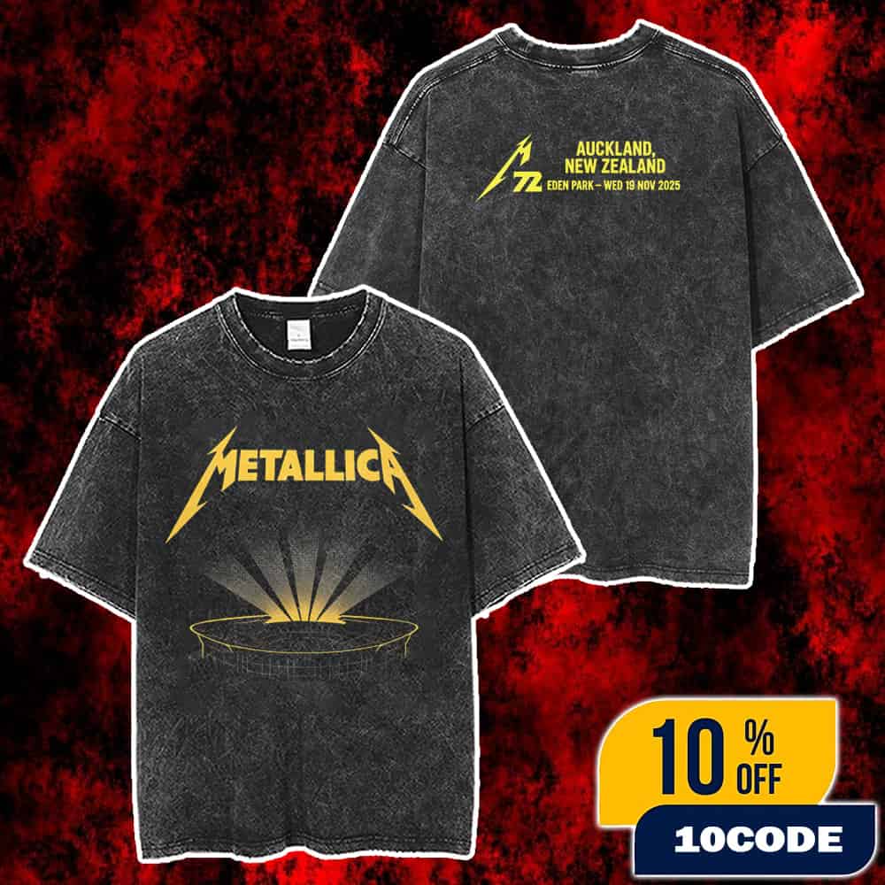 This exclusive two-sided vintage washed unisex t-shirt celebrates Metallica’s historic M72 World Tour performance on Wednesday, November 19, 2025, at Eden Park in Auckland, New Zealand, featuring distinctive stadium artwork on both front and back with a premium distressed wash finish that gives the shirt an authentic worn-in vintage aesthetic reminiscent of classic 1980s metal tour shirts, commemorating one of the biggest rock concerts in Auckland history at the nation’s premier 50,000-capacity outdoor stadium. The premium vintage-style washed merchandise showcases Eden Park’s legendary stadium design combined with Metallica’s M72 tour branding across double-sided printing, honoring the final date of Metallica’s November 2025 Australasian tour where gates open at 4:30 PM with support acts Evanescence—featuring “Bring Me to Life” hitmaker Amy Lee—and legendary punk thrash pioneers Suicidal Tendencies performing from 5:30 PM before Metallica takes the stage at 7:30 PM featuring their revolutionary in-the-round Snake Pit stage configuration that extends from the center of the stadium floor, allowing fans unprecedented 360-degree proximity to James Hetfield, Lars Ulrich, Kirk Hammett, and Robert Trujillo as they deliver their genre-defining thrash metal anthems from all angles, with the two-sided washed design offering maximum visual impact and vintage appeal. This collectible vintage washed stadium artwork shirt commemorates Metallica’s return to Eden Park—Auckland’s historic sports and entertainment venue that has hosted rugby World Cups, cricket matches, and legendary concerts—where the band will perform career-spanning setlists featuring classics including “Master of Puppets,” “Enter Sandman,” “Nothing Else Matters,” “One,” “Fade to Black,” “The Unforgiven,” and tracks from their latest album “72 Seasons” released in April 2023, with the M72 tour’s unique no-repeat setlist philosophy ensuring Auckland fans witness songs potentially different from the band’s Sydney, Melbourne, or Brisbane performances earlier in the Australian leg, while the distressed wash finish adds authentic collectible appeal reminiscent of vintage tour merchandise from Metallica’s legendary 1980s-1990s touring era. The Auckland Eden Park two-sided washed merchandise represents the culmination of Metallica’s record-breaking M72 world tour that began in 2023 and spans multiple continents through 2025, with the New Zealand show marking the band’s first Auckland performance since their legendary November 26, 2013 concert at Vector Arena, featuring ticket prices ranging from NZD $103-3,998 for various seating options including General Admission standing areas, reserved seating sections, and the coveted “Nothing Else Matters” Snake Pit Experience VIP package offering central floor placement surrounded by the band’s stage setup, plus free public transport included with all concert tickets via Auckland Transport’s special event services, making this limited-edition vintage washed stadium artwork shirt with double-sided printing the ultimate collectible celebrating over 40 years of Metallica’s thrash metal dominance and their historic New Zealand performance.