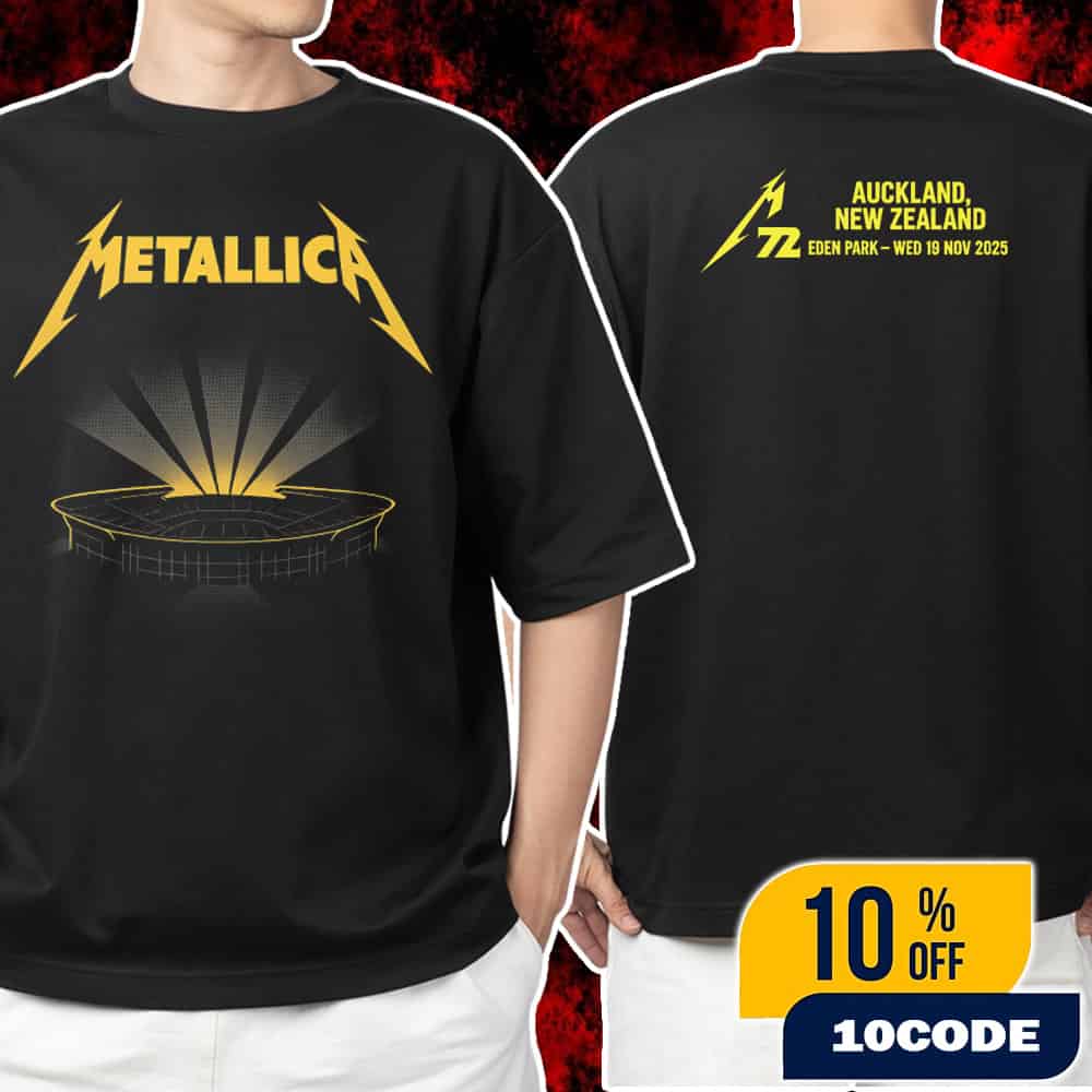 This exclusive unisex t-shirt celebrates Metallica’s historic M72 World Tour performance on Wednesday, November 19, 2025, at Eden Park in Auckland, New Zealand, featuring distinctive stadium artwork that captures the iconic venue’s architecture and significance as the site of Metallica’s triumphant return to New Zealand’s largest city after 12 years, commemorating one of the biggest rock concerts in Auckland history at the nation’s premier outdoor stadium. The premium event merchandise showcases Eden Park’s legendary 50,000-capacity stadium design combined with Metallica’s M72 tour branding, honoring the final date of Metallica’s November 2025 Australasian tour where gates open at 4:30 PM with support acts Evanescence—featuring “Bring Me to Life” hitmaker Amy Lee—and legendary punk thrash pioneers Suicidal Tendencies performing from 5:30 PM before Metallica takes the stage at 7:30 PM featuring their revolutionary in-the-round Snake Pit stage configuration that extends from the center of the stadium floor, allowing fans unprecedented 360-degree proximity to James Hetfield, Lars Ulrich, Kirk Hammett, and Robert Trujillo as they deliver their genre-defining thrash metal anthems from all angles. This collectible stadium artwork shirt commemorates Metallica’s return to Eden Park—Auckland’s historic sports and entertainment venue that has hosted rugby World Cups, cricket matches, and legendary concerts—where the band will perform career-spanning setlists featuring classics including “Master of Puppets,” “Enter Sandman,” “Nothing Else Matters,” “One,” “Fade to Black,” “The Unforgiven,” and tracks from their latest album “72 Seasons” released in April 2023, with the M72 tour’s unique no-repeat setlist philosophy ensuring Auckland fans witness songs potentially different from the band’s Sydney, Melbourne, or Brisbane performances earlier in the Australian leg. The Auckland Eden Park merchandise represents the culmination of Metallica’s record-breaking M72 world tour that began in 2023 and spans multiple continents through 2025, with the New Zealand show marking the band’s first Auckland performance since their legendary November 26, 2013 concert at Vector Arena, featuring ticket prices ranging from NZD $103-3,998 for various seating options including General Admission standing areas, reserved seating sections, and the coveted “Nothing Else Matters” Snake Pit Experience VIP package offering central floor placement surrounded by the band’s stage setup, plus free public transport included with all concert tickets via Auckland Transport’s special event services, making this limited-edition stadium artwork shirt the ultimate collectible celebrating over 40 years of Metallica’s thrash metal dominance and their historic New Zealand performance.
