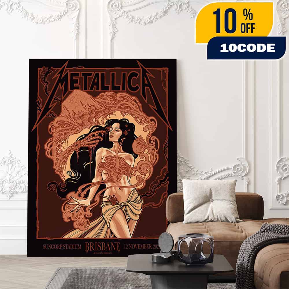 The Metallica M72 Brisbane Exclusive Limited Edition Poster Event Artwork By Teniele Sadd World Tour On November 12 2025 At Suncorp Stadium Australia Poster Canvas Home Decor transforms the stunning original concert poster artwork from Metallica’s historic Brisbane performance into premium gallery-quality canvas wall art, commemorating the legendary thrash metal icons’ epic return to Brisbane’s 52,500-capacity Suncorp Stadium on Wednesday, November 12, 2025, as part of their record-breaking M72 World Tour supporting their Grammy Award-winning 11th studio album “72 Seasons” (April 2023), marking their first Australian tour in 12 years with founding members James Hetfield (vocals/rhythm guitar), Lars Ulrich (drums), Kirk Hammett (lead guitar), and Robert Trujillo (bass) performing in their revolutionary 360° in-the-round stage setup. This exclusive canvas print features the limited edition Brisbane-specific artwork by acclaimed Australian concert poster artist Teniele Sadd, known for her distinctive silkscreen designs for major rock acts including Queens of the Stone Age and Foo Fighters, continuing Metallica’s decade-long tradition of commissioning unique, location-specific tour poster artwork that typically sells out rapidly at venues (with signed/numbered editions of 350 at each show followed by artist-released editions of 70 that immediately sell out online), making canvas reproductions highly sought-after by collectors who want to preserve and display these exclusive designs as museum-quality wall art. Available in multiple sizes ranging from standard poster dimensions to large-format wall art, this canvas home decor piece utilizes premium museum-grade stretched canvas with fade-resistant archival inks, gallery-wrapped edges, and ready-to-hang mounting options that transform the original concert poster design into sophisticated home or office wall art suitable for living rooms, man caves, music rooms, or any space dedicated to celebrating rock and roll culture, offering the visual impact of framed concert memorabilia at accessible prices typically ranging from £4.49 to £59.99 depending on size and finishing options. This Brisbane-exclusive canvas print serves as permanent home decor that commemorates one of Queensland’s most anticipated rock events (presented by Live Nation with tickets originally ranging from $105 to $750 AUD that sold out rapidly), featuring Teniele Sadd’s city-specific artwork that distinguishes the November 12th show from other Australian M72 tour dates including Perth (November 1), Adelaide (November 5), Melbourne (November 8), and Sydney (November 15), making it an ideal collectible for fans who attended the concert (with special guests Suicidal Tendencies at 5:30 PM and Evanescence at 6:45 PM before Metallica’s 8:30 PM set) or music enthusiasts who appreciate the intersection of concert memorabilia and contemporary wall art that celebrates nearly five decades of Metallica’s heavy metal dominance, with over 125 million albums sold globally and recognition as one of the most influential rock acts in history.