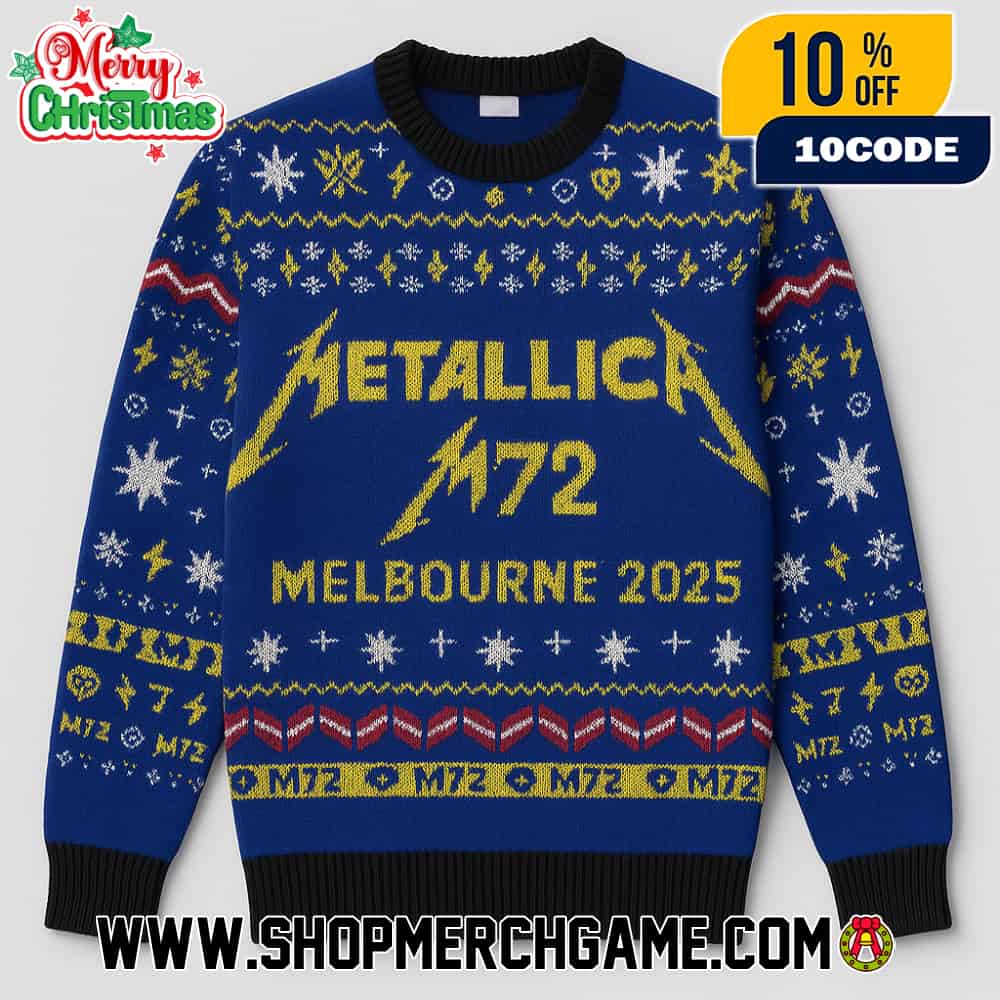 The Metallica M72 Melbourne 2025 Tour Ugly Christmas Sweater is an exclusive unisex knitted holiday jumper commemorating Metallica’s record-breaking M72 World Tour, which arrives at Marvel Stadium in Melbourne, Victoria, Australia on Saturday, November 8, 2025, featuring legendary thrash metal pioneers Metallica with support from Evanescence and Suicidal Tendencies in an all-ages, stadium-wide event. This festive pullover celebrates Metallica’s global touring initiative that began on April 27, 2023, in Amsterdam and continues through July 2026, representing one of the most ambitious concert tours in modern rock history, with each show featuring the band’s iconic Snake Pit stage configuration extending from the front-stage performance area and enhanced premium experiences including meet-and-greet opportunities, Black Box Lounge access, and early venue entry. The sweater’s design incorporates a snowflake gold logo detail paying homage to the winter holiday season while maintaining Metallica’s signature heavy metal aesthetic, perfect for fans attending the sold-out Melbourne show or participating in the exclusive M72 Pop-Up Shop operating November 7-9, 2025, at Second Story Studios in Collingwood, which will feature limited splatter vinyl editions, exclusive screen-printed event merchandise, and tour-specific collectibles. Marvel Stadium’s Melbourne location at Docklands in metropolitan Victoria provides an iconic venue setting in Australia’s cultural capital, and attending fans can explore the official #M72 interactive map for venue information, take advantage of enhanced ticket packages via metallicatravel.com, and participate in concurrent community initiatives including blood drives and Foodbank Victoria partnerships supporting local charitable causes. Crafted from premium knit materials with unisex construction available in multiple sizes, this holiday sweater serves as authentic concert merchandise and collectible memorabilia capturing the M72 World Tour’s historic 2025 Australian leg, making it an ideal festive gift for dedicated Metallica fans, tour attendees, and collectors of concert-specific holiday apparel.
