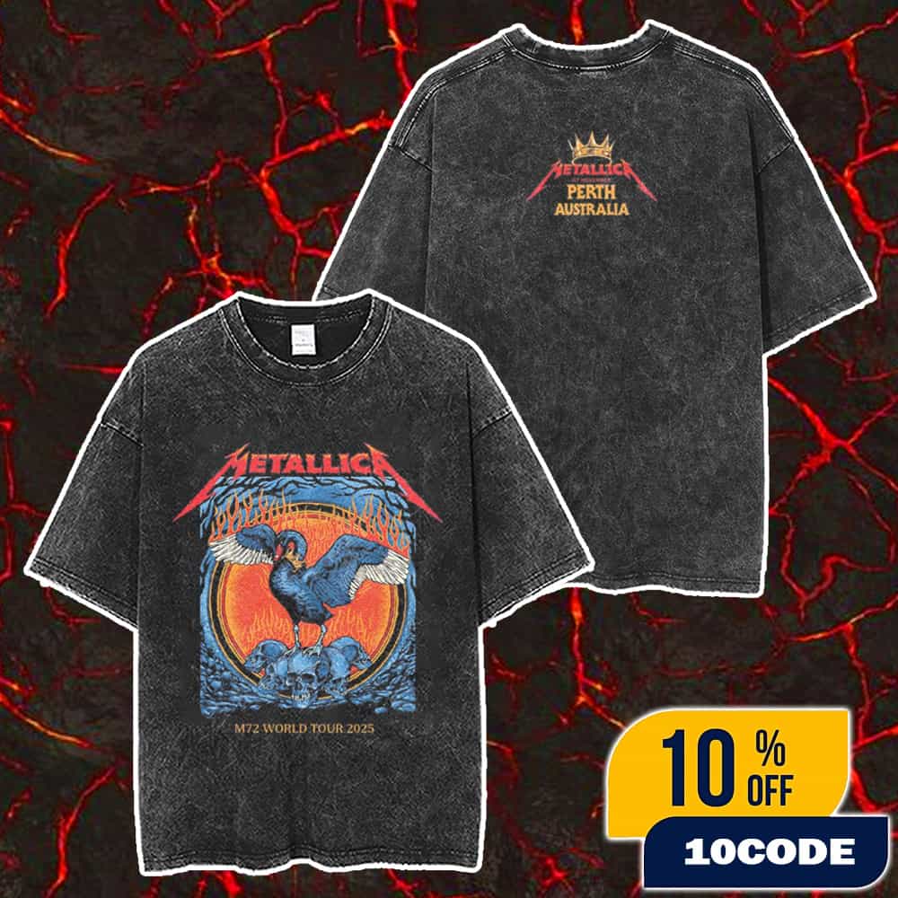 The Metallica M72 Perth Australia 2025 Event Tee 2-Sides Artwork By Ben Brown Pop-Up Exclusive Merch At Optus Stadium On November 1 2025 Washed T-Shirt represents a limited-edition, city-exclusive collectible from the legendary M72 World Tour—Metallica’s groundbreaking global concert series in support of their 2023 album “72 Seasons”—specifically showcasing the iconic Perth stop at Optus Stadium on November 1, 2025, marking the band’s triumphant return to Western Australia after their last Australian appearance in 2013. This premium washed tee features exclusive double-sided artwork crafted by renowned visual artist Ben Brown specifically for the Perth M72 Pop-Up Shop, which operated exclusively at Murray Street Mall (239 Murray Street, Perth WA 6000) from October 31 through November 2, 2025, with limited quantities that sold out early due to massive fan demand, making this pop-up merchandise one of the rarest collectibles from the M72 tour infrastructure. The November 1 Perth concert delivered a legendary setlist featuring Metallica’s complete catalog ranging from thrash classics like “Master of Puppets,” “Enter Sandman,” and “Sad but True” alongside deep cuts from the “72 Seasons” album, supported by international powerhouses Evanescence and Suicidal Tendencies, with an estimated attendance exceeding 50,000 fans creating an unforgettable night of heavy metal history at one of Australia’s premier stadium venues. Metallica’s M72 World Tour revolutionized stadium touring through its innovative in-the-round stage design relocating the famous Snake Pit to center stage, feature two completely different setlists and support lineups for each city’s shows, and continues through 2026 as the band’s most ambitious tour since their early career triumphs, with a portion of ticket proceeds benefiting the All Within My Hands foundation that has raised nearly $13 million for career education and disaster relief programs. This exclusive Ben Brown-designed washed t-shirt serves as authenticated concert memorabilia from the Perth M72 event, perfect for Metallica devotees, tour merchandise collectors, and anyone seeking to commemorate the band’s historic Australian comeback with an officially licensed, pop-up exclusive piece that captures the raw energy and artistry of one of heavy metal’s most revolutionary touring experiences.