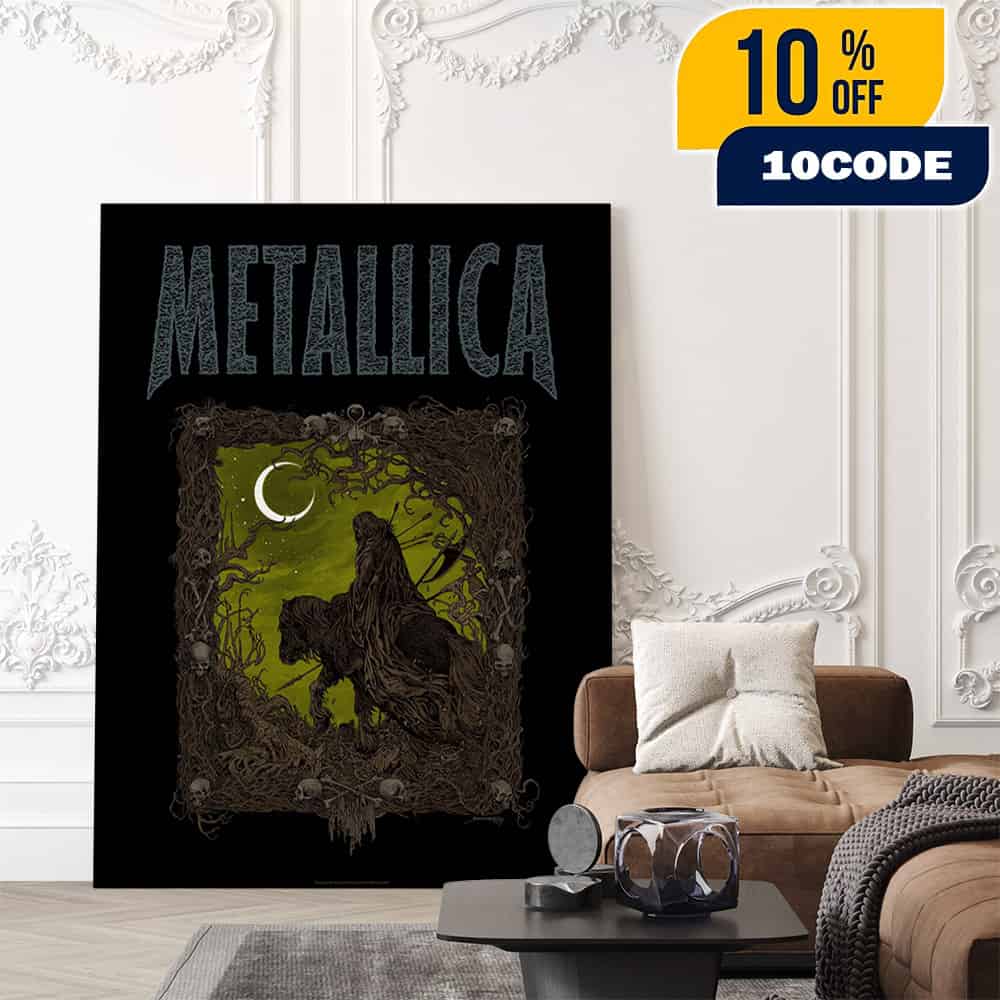 This limited-edition Metallica “The Outlaw Torn” Screen Printed Poster, illustrated by the renowned UK artist Richey Beckett, serves as the moody and atmospheric conclusion to the band’s exclusive Load poster series, celebrating the widespread success of the Load (Remastered) 2025 campaign. Released in November 2025 as a Fifth Member Exclusive through the Metallica Black Box Collection, this collectible piece captures the raw emotional weight of the album’s epic closing track, “The Outlaw Torn”—a song famous for its original 1996 manufacturing-enforced edit and subsequently restored to its full, unedited glory in this year’s remastered box set. Beckett, celebrated for his intricate intricate pen-and-ink detailing, created this artwork utilizing traditional walnut ink and dip pens to mirror the grit and bluesy shift that defined the Load era, moving away from thrash into deeper, alternative territories. This official merchandise drop is strictly limited and numbered, with lucky collectors potentially receiving rare foil variants randomly inserted into orders, making it a high-value target for serious archivists. The poster measures a standard 18″ x 24” and is printed on premium stock, categorized within the Black Box Collection, which functions as Metallica’s digital museum and archival store dedicated to preserving their extensive history. By owning this piece, fans not only acquire a stunning visual interpretation of James Hetfield’s lyrics about waiting and longing but also commemorate the 2025 remastering project that revitalized the controversial yet beloved mid-90s era for a modern audience. The release coincides with the broader 2025 reissue activities, where the band revisited the “Black Album” successor with upgraded sonics, highlighting the intricate production of Bob Rock. As a “Fifth Member” perk, this 2025 Poster Canvas art print exemplifies the band’s dedication to their core fanbase, offering tangible, high-fidelity connections to their sonic legacy through the lens of elite contemporary gig poster artists.