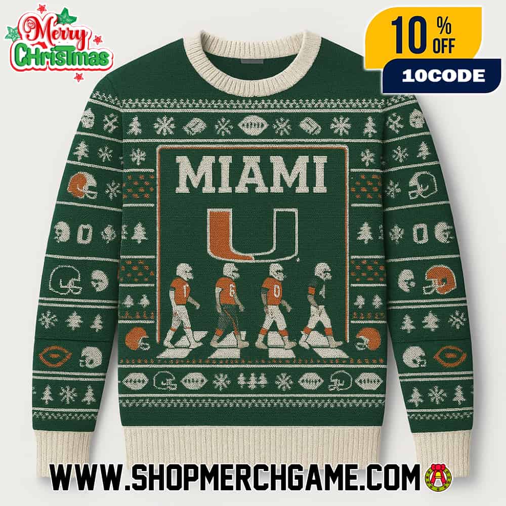 This Miami Hurricanes Abbey Road football players crossing ugly Christmas sweater features a Beatles-inspired design adorned with the iconic split-U logo in the university’s legendary orange and green colors—created in 1973 by Miami-bred publicist Julian Cole and graphic artist Bill Bodenhamer for the Athletic Federation (now the Hurricane Club), with the distinctive design representing the University of Miami without having to say those words while different sport images were inserted in the middle of the U. The University of Miami Hurricanes, competing in their 100th season of football in 2025, represent one of college football’s most dominant programs playing home games at Hard Rock Stadium in Miami Gardens, Florida, with five national championships (1983, 1987, 1989, 1991, and 2001) establishing them as one of the greatest dynasties in college football history. The 2025 season has been a resurgence for “The U” with a 6-2 overall record and 2-2 ACC mark through early November, highlighted by a thrilling 27-24 season-opening victory over Notre Dame at home that set the tone for the Hurricanes’ championship aspirations as they chase their first ACC Championship Game appearance since joining the conference. Head coach Mario Cristobal has the Hurricanes positioned to reach the ACC Championship Game in Charlotte—which would likely secure a spot in the 12-team College Football Playoff—requiring a strong 7-1 conference finish to achieve what has eluded Miami since joining the ACC, with marquee matchups remaining including road games against Florida State and Syracuse that will determine their playoff destiny. This Fair Isle knitted holiday pullover in orange and green serves as the perfect seasonal apparel for Hurricanes fans to celebrate their team’s championship dynasty legacy, the iconic split-U logo created in 1973 that became so synonymous with excellence that Miami became known simply as “The U,” and the passionate “Canes” spirit that continues to unite generations of Miami faithful during the holiday season.