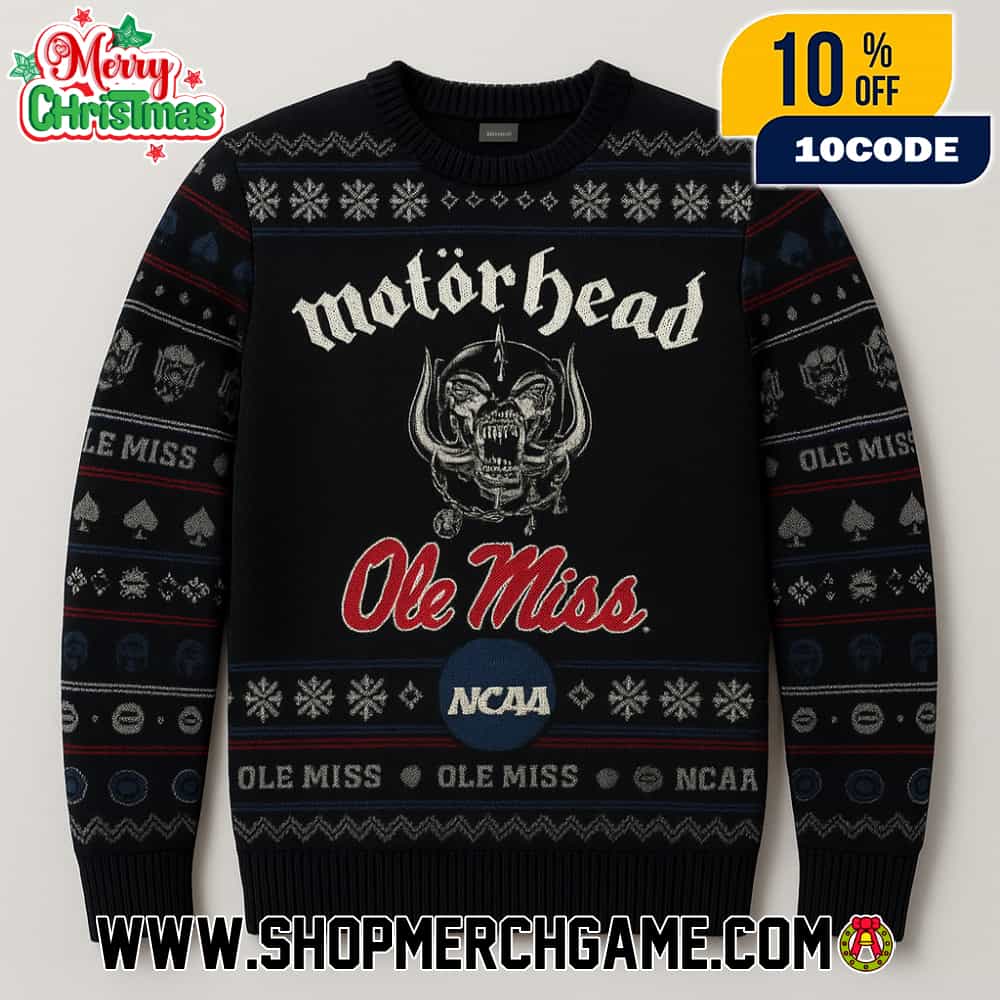 This Motörhead x Ole Miss Rebels NCAA ugly sweater merges two iconic American institutions—the legendary English heavy metal band Motörhead, founded in 1975 by bassist and vocalist Lemmy Kilmister and ranked number 26 on VH1’s 100 Greatest Artists of Hard Rock with over 25 million albums sold worldwide, and the University of Mississippi’s historic Ole Miss Rebels football program competing in the Southeastern Conference (SEC) since 1893, which has won six SEC titles and appeared in multiple bowl games while building one of college football’s most storied traditions in Oxford, Mississippi. The unisex knit pullover features a sophisticated color palette combining black, navy, and red that honors both Motörhead’s iconic aesthetic and Ole Miss Rebels’ official crimson and navy branding, creating a unique holiday graphic apparel piece that celebrates the unexpected intersection of heavy metal music culture and NCAA college football heritage for fans who appreciate both hard rock rebellion and collegiate athletics. This one-of-a-kind ugly Christmas sweater represents a dual-fandom crossover specifically designed for enthusiasts who support legendary rock music legends while maintaining strong connections to Ole Miss athletic programs, making it an authentic collectible conversation piece that captures the unconventional partnership between Britain’s most influential metal pioneers and one of America’s most prestigious SEC football institutions, perfect for holiday gatherings, tailgates, and campus events where Motörhead devotees and Rebels fans converge to celebrate their shared passion for powerful performances and uncompromising artistic expression.