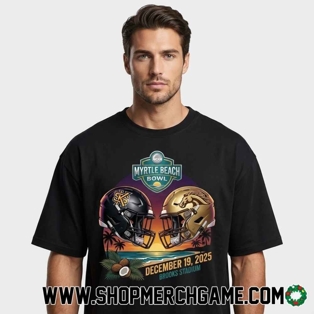 This officially licensed unisex t-shirt commemorates the helmet-to-head championship collision at the 2025 Myrtle Beach Bowl presented by Engine, where Conference USA champion Kennesaw State Owls (10-3) face MAC champion Western Michigan Broncos (9-4) on Friday, December 19, 2025, at 11:00 AM EST at Brooks Stadium in Conway, South Carolina. The sixth annual Myrtle Beach Bowl, broadcast nationally on ESPN, features a historic first-ever meeting between these two Group of Five conference champions, with Kennesaw State making their inaugural bowl game appearance in just their second FBS season after defeating Jacksonville State 19-15 in the Conference USA Championship, while Western Michigan enters their 13th bowl game in program history following a dominant 23-13 MAC Championship victory over Miami at Ford Field. Both programs are led by 2025 Conference Coach of the Year award winners—Jerry Mack guiding the Owls’ remarkable turnaround and Lance Taylor directing the Broncos to a five-game winning streak entering the postseason. The matchup showcases contrasting styles with Western Michigan boasting the nation’s 15th-ranked defense allowing just 299.9 yards per game and holding opponents to 31.9% third-down conversions (14th in FBS), while Kennesaw State counters with an explosive offense averaging 404.3 yards per game led by quarterback Amari Odom’s 2,385 passing yards and 18 touchdowns, plus receiver Gabriel Benyard’s 898 receiving yards and 9 scores. This commemorative apparel celebrates both teams’ championship seasons and serves as authentic college football bowl memorabilia from a significant mid-major showdown with major bragging rights between the MAC and Conference USA at Coastal Carolina University’s home stadium.
