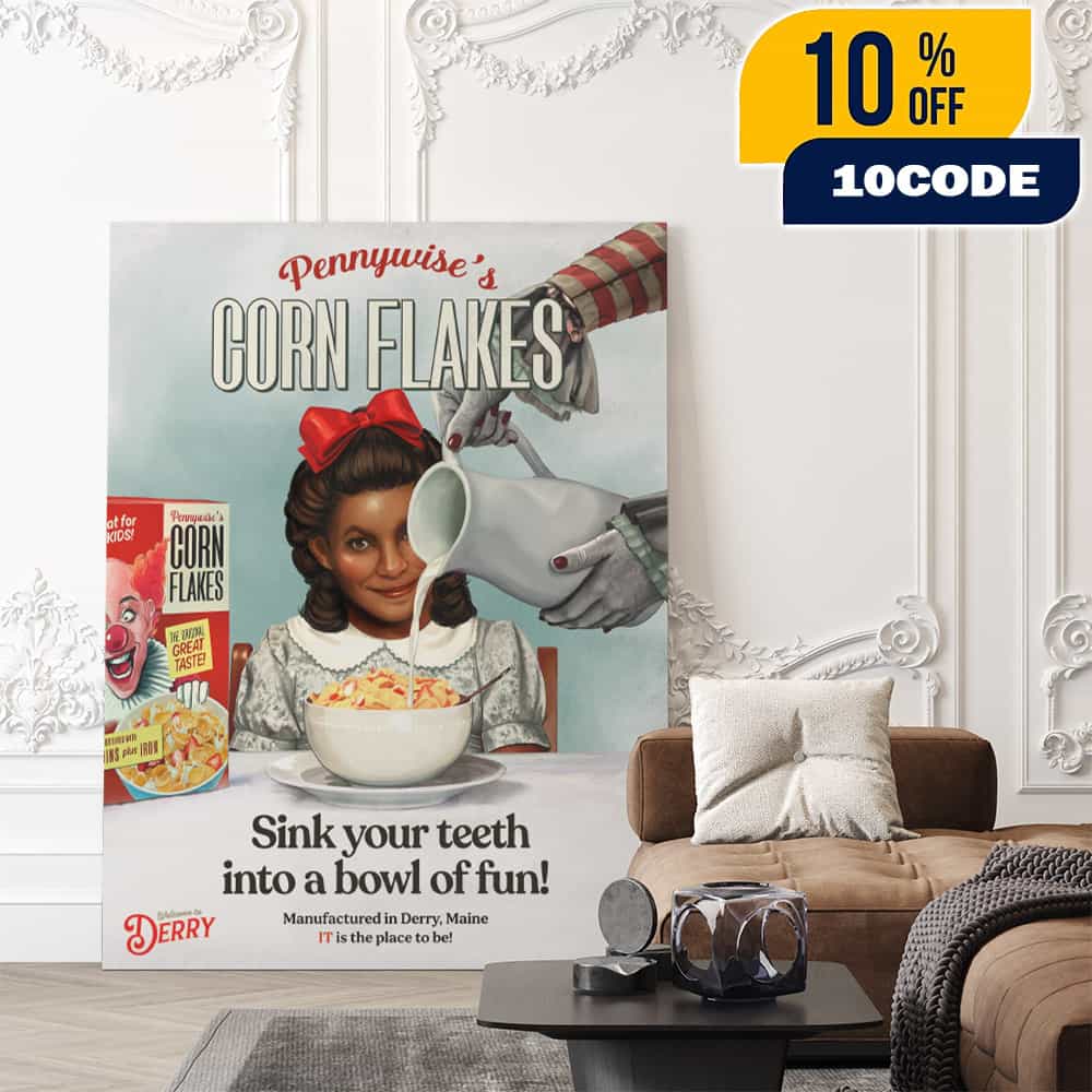 This officially licensed “IT: Welcome to Derry” canvas poster features the iconic “Pennywise’s Corn Flakes” retro advertisement design with the tagline “Sink Your Teeth Into A Bowl Of Fun,” celebrating HBO’s highly anticipated horror prequel series premiering October 26, 2025, on HBO and HBO Max. Set in 1962 Derry, Maine, the eight-episode series developed by Andy and Barbara Muschietti (directors of the blockbuster IT films) explores the terrifying 27-year cycle that precedes the 1980s events of Stephen King’s legendary novel, delving into the dark origins of Pennywise the Dancing Clown and the malevolent force that has haunted the cursed town for centuries. The series stars Bill Skarsgård reprising his iconic role as Pennywise (who also serves as executive producer), alongside Jovan Adepo as Leroy Hanlon, Taylour Paige as Charlotte Hanlon (parents of IT’s Mike Hanlon), Chris Chalk as Dick Hallorann (the psychic character from The Shining), James Remar, Stephen Rider, and Madeleine Stowe, following the young couple’s arrival in Derry just as a boy mysteriously disappears and supernatural horrors begin to unfold. This premium canvas home decor piece captures the disturbing vintage aesthetic of the series, with the darkly humorous cereal box parody reflecting Pennywise’s sinister ability to manipulate innocent imagery into nightmare fuel, as the show expands on the mythology established in the 2017 and 2019 IT films while revealing how the town’s residents became trapped in cycles of terror. Perfect for horror collectors and Stephen King enthusiasts, this poster commemorates the weekly episodic release running through the season finale on December 14, 2025, offering a chilling reminder that in Derry, Maine, evil never truly sleeps—it just waits another 27 years to feed.