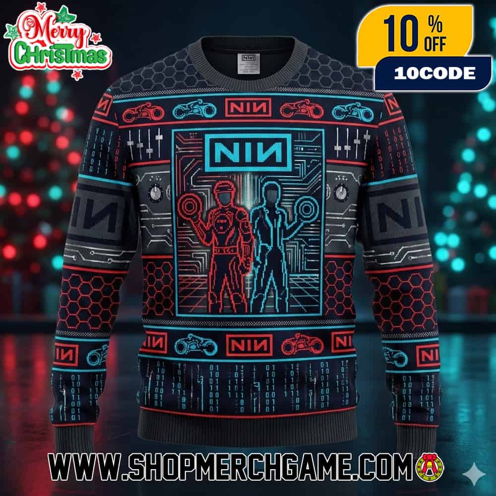 Nine Inch Nails x Tron Ares Ugly Christmas Sweater Black Red Cyan Knit Pullover With Lightcycles Binary Code Honeycomb Pattern Digital Grid Design Holiday Festive Winter Jumper