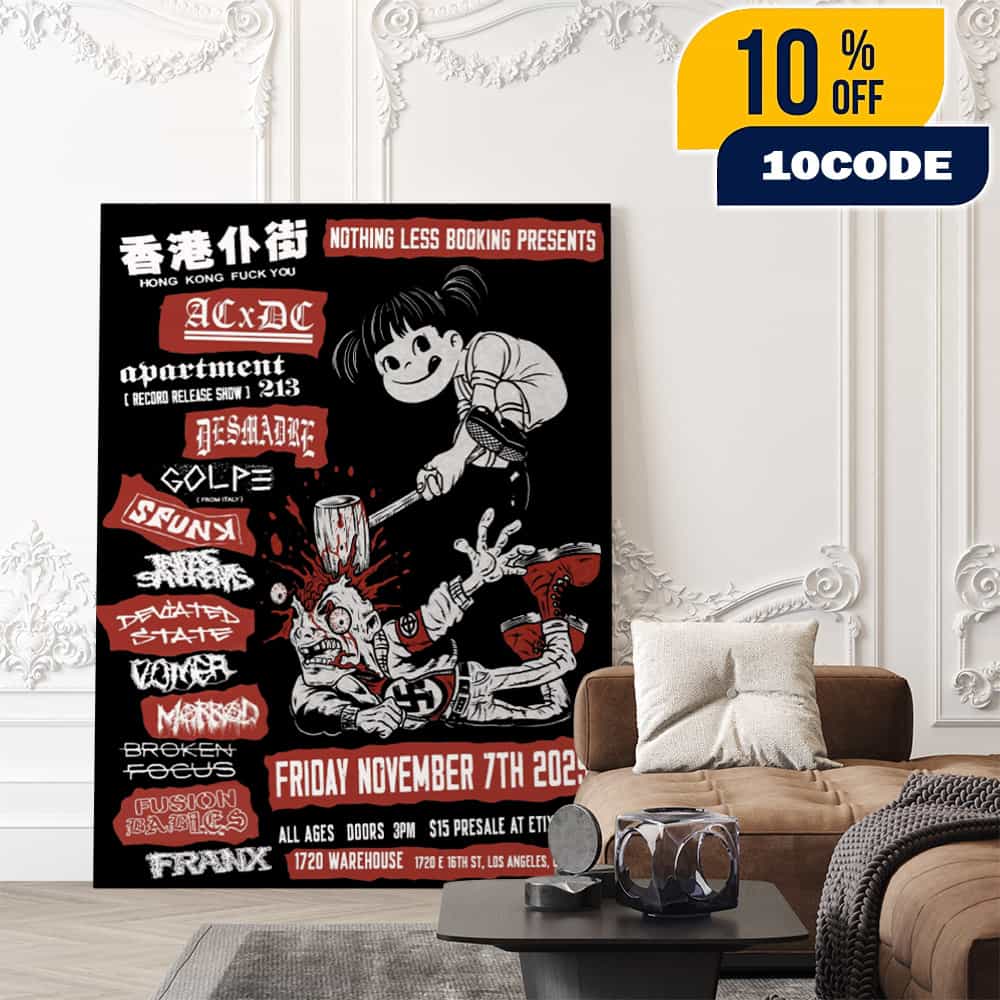 This exclusive poster canvas home decor commemorates the highly anticipated Nothing Less Booking all-ages hardcore punk event featuring Tijuana powerviolence legends Hong Kong Fuck You headlining an explosive multi-band lineup on Friday, November 7, 2025, at 4:00 PM PST at the iconic 1720 venue located at 1720 E. 16th Street, Los Angeles, California 90021, in the heart of LA’s Arts District. The event showcases Hong Kong Fuck You, the groundbreaking band founded by drummer-vocalist Christian Hell, alongside three bassists Jake Issaba, Leo Agria, and Erik Zendejas, representing a powerful multi-cultural collective of Asian, Latino, Afghani, and Black punk musicians who have revolutionized the hardcore scene with their aggressive blend of industrial metal, powerviolence, grindcore, and fastcore influences[lataco.com]. The complete verified lineup includes acclaimed acts ACxDC (with 19.5K followers on Bandsintown), Apartment 213 celebrating their record release show, Desmadre, Spunk, Tripas Sangrienta, Deviated State, Vomer, Marred, and Fusion Babies, representing the finest underground hardcore talent from the US-Mexico border region and beyond. Hong Kong Fuck You has gained international recognition for their confrontational sonic assault described as “Third World Fighting Music,” their 2020 debut album that challenged genre conventions through technically proficient instrumentation featuring multiple bass layers creating an undefinable auditory soundscape that forces listeners to reconsider musical boundaries[lataco.com]. The Tijuana-based collective draws inspiration from 1980s hardcore punk, early 2000s nu-metal, industrial metal, and California powerviolence pioneers like Neanderthal, The Locust, and Some Girls, while maintaining the DIY ethos of Mexican underground music culture where artists prioritize raw expression and emotional connection over commercial considerations[lataco.com]. Known for their physically intense live performances featuring Hell’s frenetic drumming, explosive stage presence, and provocative slogans including “Fast Drugs Slow Death,” Hong Kong Fuck You has toured extensively across Mexico, California, and completed their first Japan tour dates in 2025, building a dedicated cross-border fanbase drawn to their dangerous, emotional energy. Event tickets are available through DICE and other authorized vendors with pricing starting around $21.12 for this all-ages show, though advance booking is strongly recommended due to 1720’s intimate capacity and the high demand for this stacked lineup featuring nine bands representing the cutting edge of contemporary hardcore, powerviolence, and grindcore. This officially licensed poster artwork captures the raw aesthetic and underground authenticity of Los Angeles’s thriving punk scene, serving as a collectible piece of hardcore history that documents a landmark event bringing together Southern California’s most vital extreme music acts in one unforgettable evening at one of LA’s premier independent music venues known for championing emerging and established underground artists