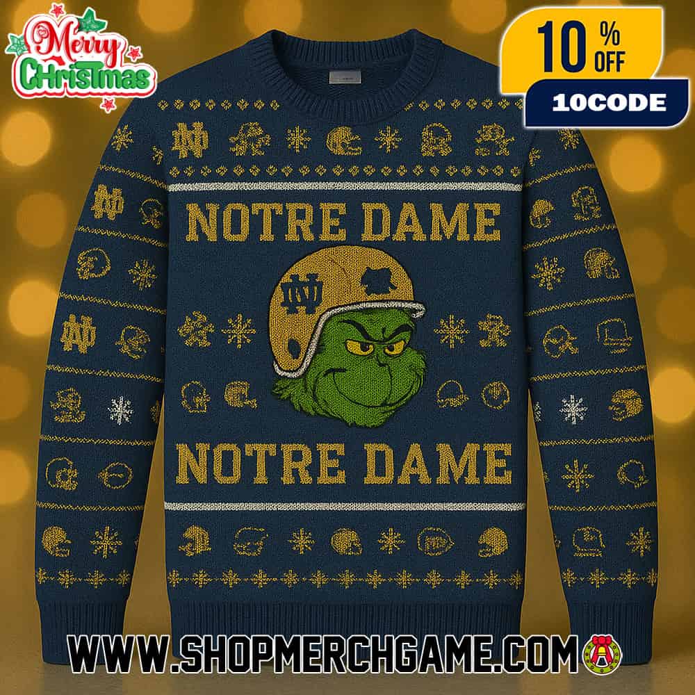 The Notre Dame Fighting Irish x Grinch NCAA Football Ugly Christmas Sweater Navy Blue Gold Knit Pullover With Helmet ND Logo Shamrock Snowflakes Fair Isle Pattern College Sports Holiday Winter celebrates one of college football’s most legendary programs, the Notre Dame Fighting Irish, who achieved a historic run to the 2025 College Football Playoff National Championship game on January 20, 2025, at Mercedes-Benz Stadium in Atlanta, where they fell to Ohio State 34-23 after an impressive playoff journey that included victories over #10 Indiana (27-17 in the first round at Notre Dame Stadium), #2 Georgia (23-10 in the Sugar Bowl quarterfinals—their first major bowl win since the 1994 Cotton Bowl Classic), and #3 Penn State (27-24 on a dramatic last-second field goal in the Orange Bowl semifinals) under head coach Marcus Freeman. Founded in 1887, the University of Notre Dame Fighting Irish football program represents one of the sport’s most storied traditions with 11 national championships (1924, 1929, 1930, 1943, 1946, 1947, 1949, 1966, 1973, 1977, 1988), seven Heisman Trophy winners, playing at the iconic Notre Dame Stadium in South Bend, Indiana—”The House That Rockne Built” opened in 1930 with current capacity of 77,622—and maintaining independence from any conference while having exclusive broadcasting rights with NBC since 1991, making them unique in college football. The 2024-25 Fighting Irish finished with an impressive 14-2 record under second-year head coach Marcus Freeman, featuring quarterback Riley Leonard who threw two fourth-quarter touchdown passes to Jaden Greathouse in the national championship game and running back Jeremiyah Love who powered the offense through the playoff run, showcasing the program’s return to elite status after their last national title in 1988 under legendary coach Lou Holtz. This exclusive ugly Christmas sweater design merges Dr. Seuss’s beloved Christmas villain the Grinch with Notre Dame’s iconic imagery, featuring the team’s legendary navy blue and gold color scheme (representing the school’s official colors inspired by the Golden Dome atop the Main Building with its gold leaf covering), the distinctive interlocking “ND” logo, shamrock imagery honoring the university’s Irish Catholic heritage and the Fighting Irish nickname, football helmet designs showcasing Notre Dame’s classic gold helmets that are repainted before every game using real gold dust scraped from the Golden Dome, and traditional Fair Isle knit patterns with snowflakes and holiday motifs that juxtapose the Grinch’s anti-Christmas rebellion with Notre Dame’s rich Catholic tradition and football excellence. Notre Dame Stadium’s legendary atmosphere includes iconic pre-game traditions like the Player Walk where fans line up two hours and 15 minutes before kickoff, the Band of the Fighting Irish concert on Bond Hall steps 90 minutes before kickoff followed by their march to the stadium, the singing of the Victory March (considered the greatest fight song in college football), and post-game performances of “Notre Dame, Our Mother” that unite players, students, and alumni in celebrating Fighting Irish tradition dating back over a century. This premium knit pullover serves as the ultimate holiday gift for Notre Dame Fighting Irish fans celebrating the program’s historic 2025 national championship game appearance and 11 national titles, college football enthusiasts who appreciate Notre Dame Stadium’s storied atmosphere and the team’s independence as the only major program without conference affiliation, ugly sweater party attendees seeking conversation-starting sports-meets-holiday humor apparel, Notre Dame alumni and students who embrace “Play Like A Champion Today” and the legendary Touchdown Jesus mural, and anyone celebrating the intersection of Catholic university tradition, college football excellence, Irish heritage, Dr. Seuss nostalgia, and festive Christmas spirit wrapped in navy blue and gold Fair Isle glory featuring the Grinch, interlocking “ND” logo, shamrocks, gold helmets, and snowflakes that honor both Fighting Irish championship tradition and holiday cheer.