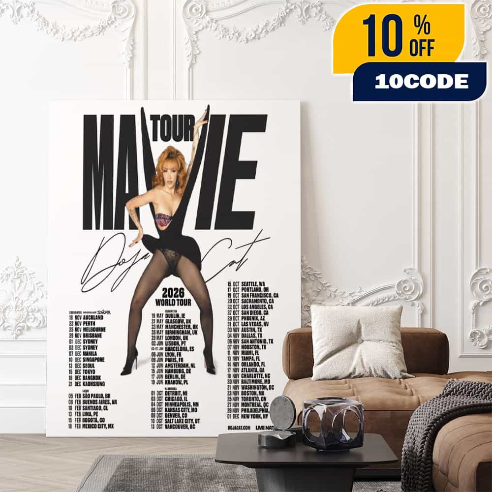 This official Live Nation Doja Cat Tour Ma Vie World Tour 2026 Poster Canvas Home Decor represents the ultimate collector’s piece for fans of the Grammy Award-winning artist’s groundbreaking global tour, featuring a premium canvas print showcasing the complete tour schedule from February 5, 2026 in São Paulo, Brazil through December 1, 2026 at Madison Square Garden in New York City. The high-quality canvas artwork displays all 50+ tour dates supporting Doja Cat’s fifth studio album “Vie” released in September 2025, including iconic venues such as The O2 in London, 3Arena in Dublin, United Center in Chicago, Little Caesars Arena in Detroit, Kia Forum in Los Angeles, T-Mobile Arena in Las Vegas, and major arenas across Australia, New Zealand, and Asia, making it a sophisticated wall art piece that celebrates this historic musical milestone. Designed with Doja Cat’s signature aesthetic elements and authentic tour branding, this officially licensed Live Nation canvas poster transforms any living space into a tribute to one of today’s most influential pop artists, featuring museum-quality printing that preserves the vibrant colors and detailed tour information for years to come. Perfect for music enthusiasts, collectors, and interior design lovers, this canvas home decor piece captures the essence of Doja Cat’s “Ma Vie” era, including her hit singles like “Jealous Type” and collaborations with SZA, while serving as a conversation starter and artistic focal point that commemorates the artist’s first time headlining across multiple continents in this landmark world tour.