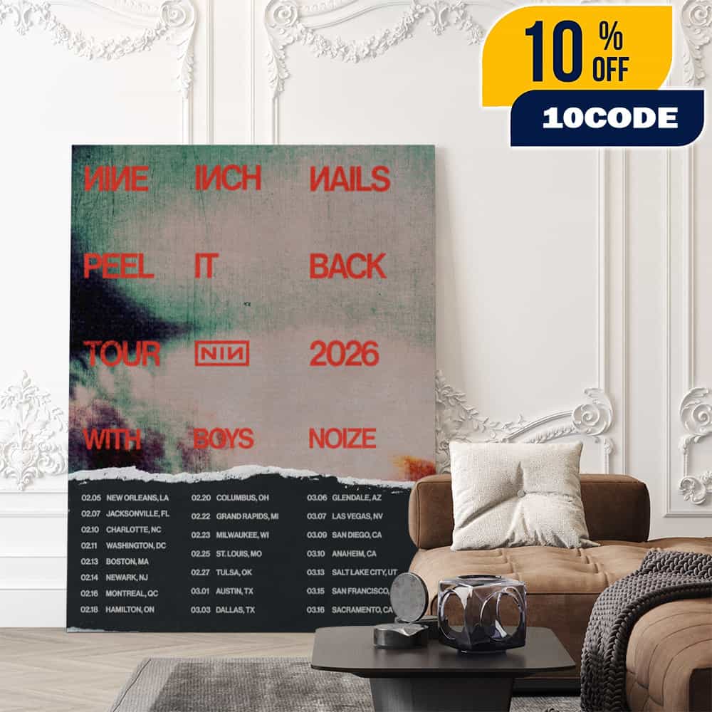 This official Nine Inch Nails “Peel It Back Tour 2026” canvas poster artwork commemorates the groundbreaking continuation of the industrial rock legends’ most ambitious touring cycle, featuring their innovative collaboration with German techno pioneer Boys Noize (Alex Ridha) across 22 North American venues from February 5-March 16, 2026, including major arenas in New Orleans (Smoothie King Center), Jacksonville (VyStar Veterans Memorial Arena), Charlotte (Spectrum Center), Washington DC (Capital One Arena), Boston (TD Garden), Newark (Prudential Center), Montreal (Bell Centre), Hamilton (FirstOntario Centre), and premier venues in Columbus, Grand Rapids, Milwaukee, St. Louis, Tulsa, Austin, Dallas, Glendale, Las Vegas, San Diego, Anaheim, Salt Lake City, San Francisco, and Sacramento. This premium canvas home decor piece showcases the distinctive grunge-industrial poster artwork featuring the iconic distressed aesthetic and torn paper design that defines Nine Inch Nails’ visual identity, perfectly capturing the fusion of Trent Reznor and Atticus Ross’s dark industrial soundscapes with Boys Noize’s pulsating electronic beats in their revolutionary “Nine Inch Noize” collaborative project that debuted during their B-stage performances throughout their sold-out 2025 world tour. Available exclusively through the official Nine Inch Nails online store at $45 USD (£45 UK), this limited edition poster represents the band’s triumphant return to major touring after their historic 2025 “Peel It Back” world tour that spanned 34 performances across Europe and North America, featuring cutting-edge stage production with rain visuals, moving silhouettes, curtain drops, and revolutionary 3D projection technology onto translucent fabric that redefined live concert experiences. Following Nine Inch Nails’ induction into the Rock & Roll Hall of Fame in 2020 and their continued success as Academy Award and Grammy-winning artists with over 30 million records sold worldwide, this canvas artwork serves as both collectible memorabilia and sophisticated home decor for fans of the band’s evolution from their 1989 platinum debut “Pretty Hate Machine” to their current status as pioneers bridging industrial rock and electronic music through innovative live performances and film scoring achievements including wins for “The Social Network,” “Soul,” and “Watchmen”. This official merchandise embodies Nine Inch Nails’ commitment to pushing artistic boundaries both musically and visually, allowing fans to bring the immersive experience of the Peel It Back Tour into their living spaces through museum-quality canvas printing that captures the band’s 37-year legacy as one of the most influential acts in alternative and industrial music history.