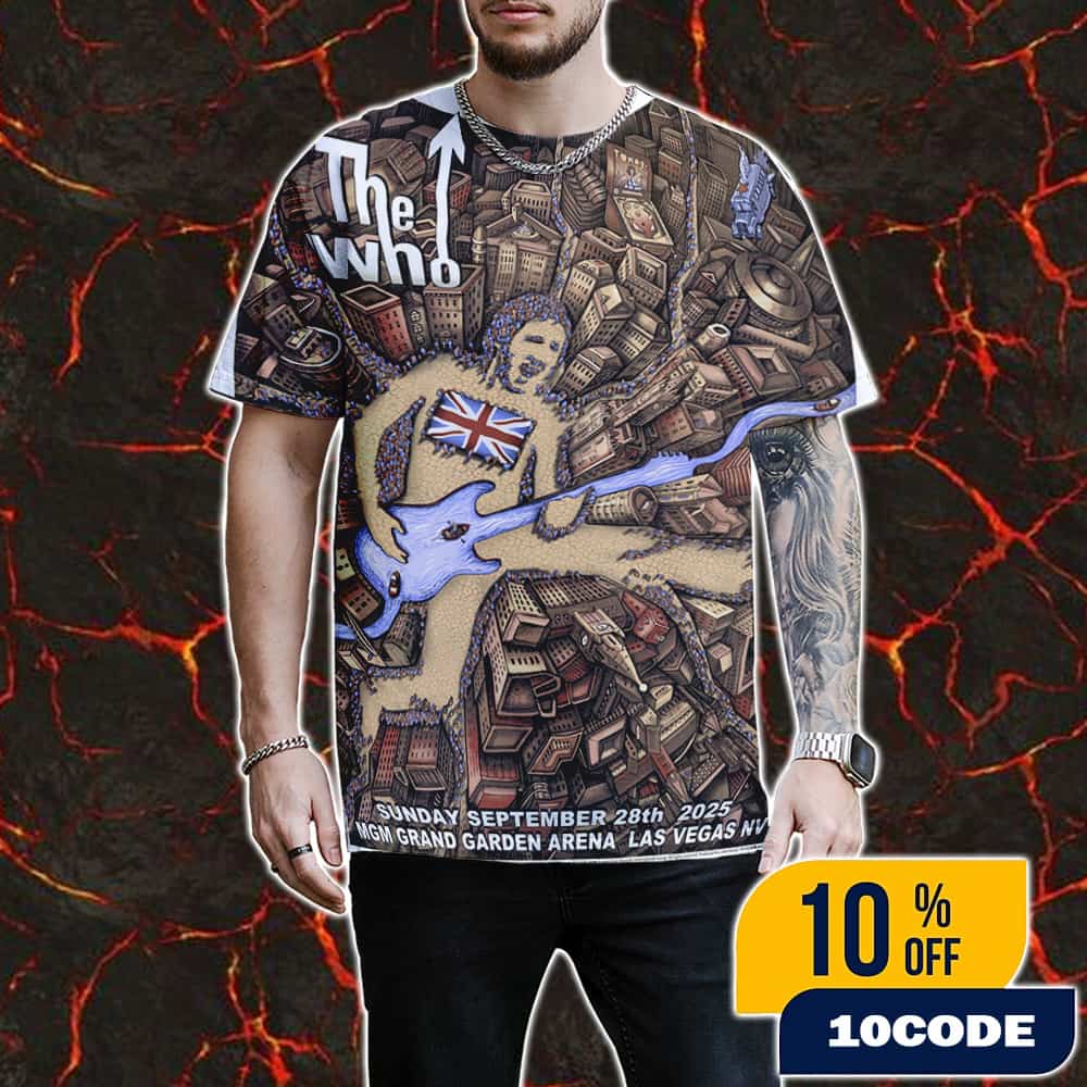 This Official The Who Event Poster commemorates the legendary British rock band’s final North American performance on September 28, 2025, at the MGM Grand Garden Arena in Las Vegas as part of their bittersweet “The Song Is Over” North American Farewell Tour, marking the end of their illustrious six-decade career. The exclusive poster features striking artwork by renowned concert poster artist Emek Golan, whose psychedelic and mind-bending design style has made him a leading figure in rock memorabilia art, having created iconic posters for bands like Radiohead, Tool, and Pearl Jam. This historic Las Vegas show represents the culmination of The Who’s 17-date farewell tour, featuring founding members Pete Townshend (80) and Roger Daltrey (81) performing career-spanning hits from classics like “Who’s Next” and “Quadrophenia” alongside special guest Billy Idol. The 3D T-shirt design captures the emotional significance of this farewell concert, where the band delivers their final goodbye to American and Canadian fans in the iconic 17,000-capacity MGM Grand Garden Arena, with doors opening at 6:30 PM and showtime at 7:30 PM. Originally scheduled as the tour’s final date before an additional October 1st show was added, this September 28th Las Vegas performance holds special collector value as official merchandise from one of rock history’s most influential bands’ last major tour.
